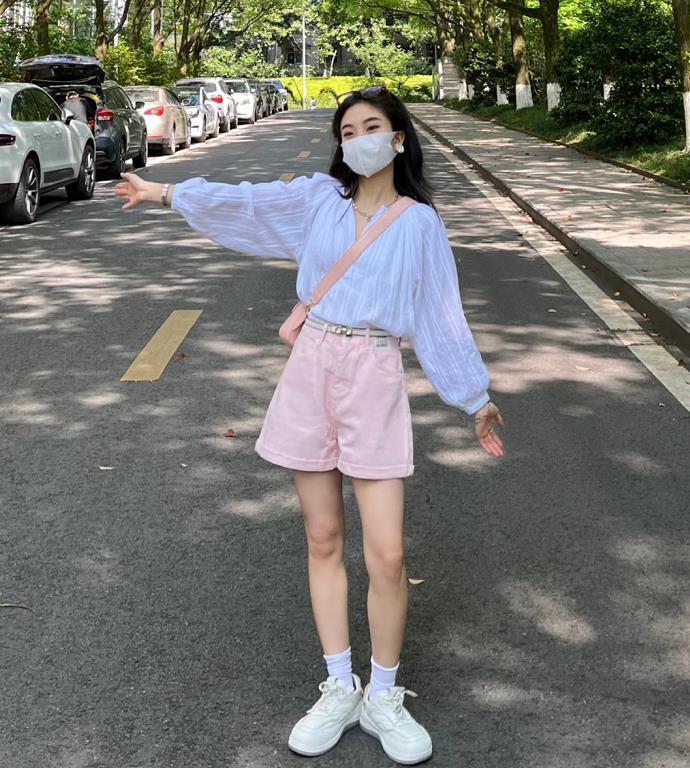 今年春季真的是很流行穿粉色,这种浅浅淡淡的粉色,相信没有谁会拒绝吧?低饱和度的浅粉色牛仔短裤,搭配白色长袖衬衫,整个人看起来很减龄又不失甜美感。法式风的白衬衫,穿起来超显气质的,深v领设计,巧妙拉长脖子线条,灯笼袖的设计,手臂粗的姐妹最合适了。