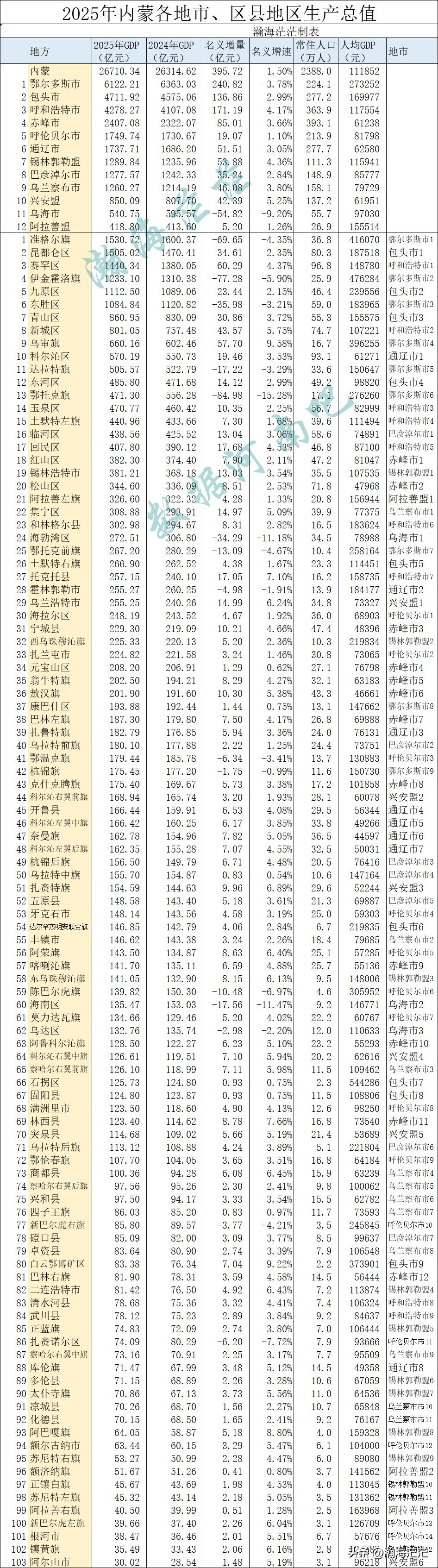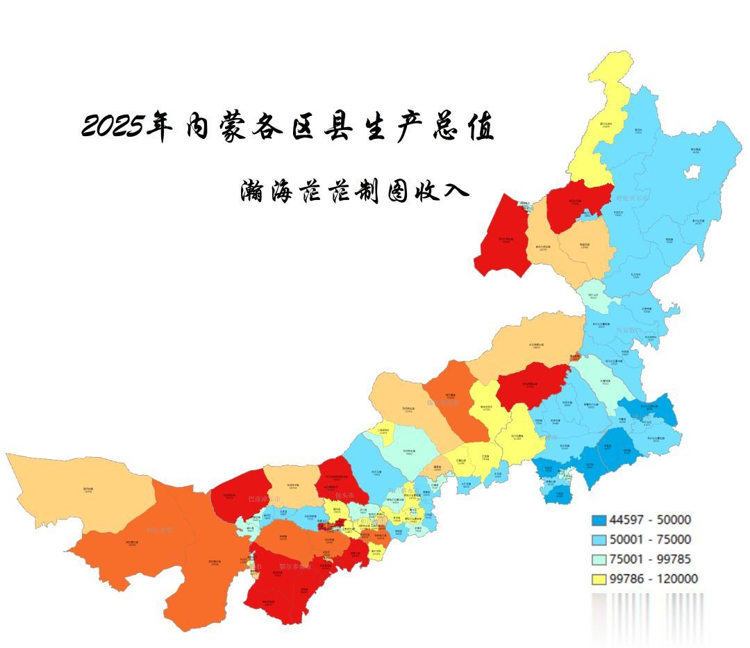 2025年内蒙各地市、区县地区生产总值如下: