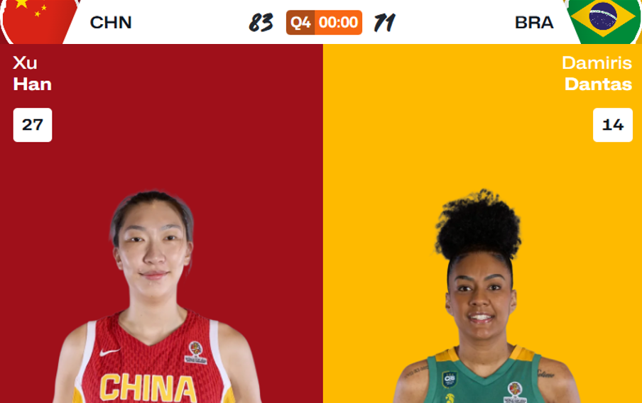 第三节罗欣棫、韩旭、张曼曼开局命中4个3分拉大分差,比分来到58-46,中国的外线苦等多日迎来多点开花,随后连续快攻得手到66-50,王思雨2+1打成,比赛为69-54。第四节千半段只依靠王思雨两罚一中得到1分,中国陷入得分荒,外线连续不中,巴西趁机追到70-62,韩旭勾手命中+两罚全中止住颓势,张子宇空篮也有到76-64,张子宇、韩旭、陈明伶、王思雨累计八罚七中也有到83-71锁定胜局,前半节中国只有1分,后半节除罚篮外也只得到6分。赛后,中国83-71巴西。
