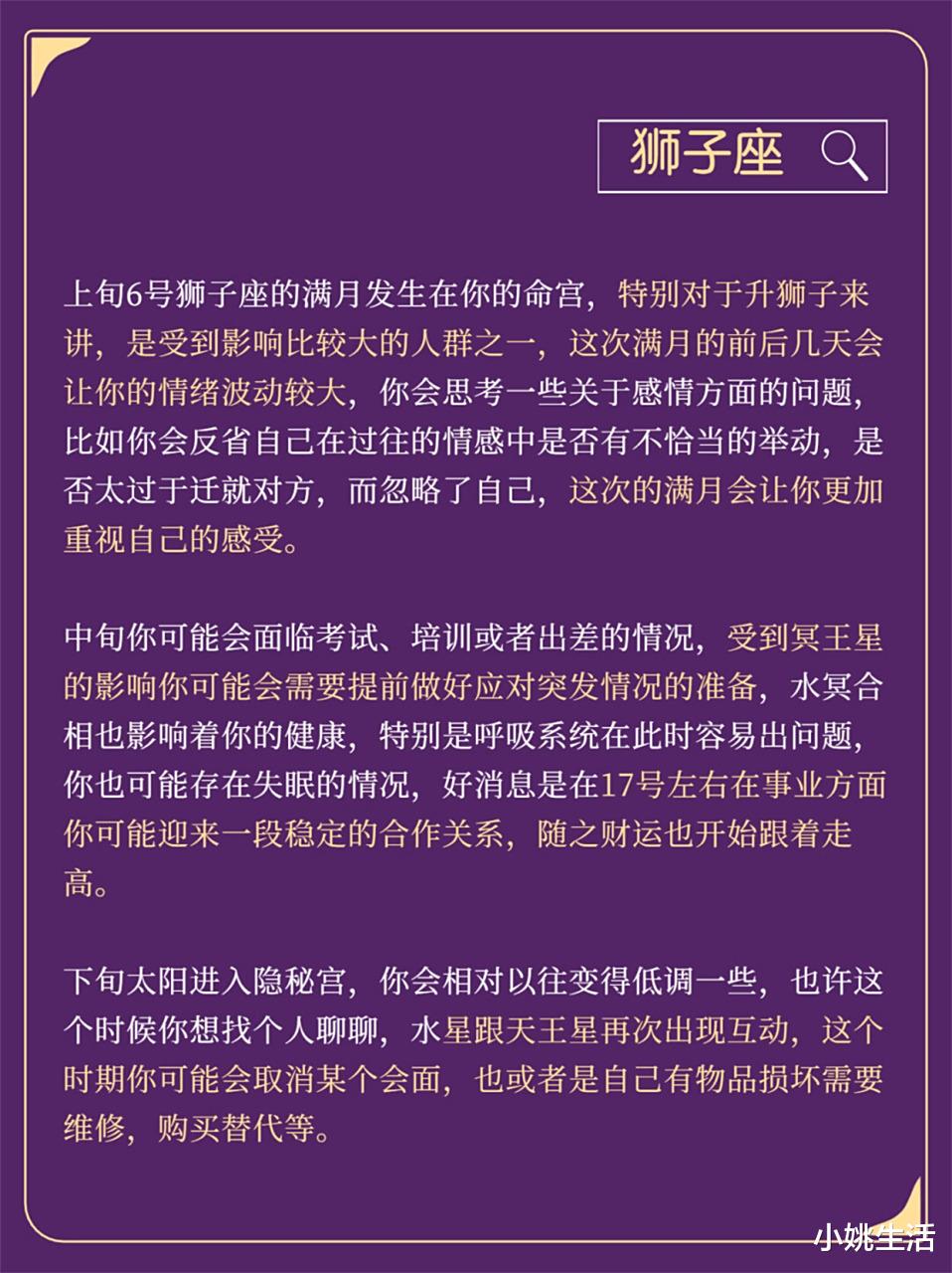 事业:合作合同、代理协议、经纪约进入“生死谈判”。顺行后两周内,旧客户可能带着更大预算回头,但条件也更苛刻——要求分成、股权、决策权。狮子要做的不是“一言堂”,而是把个人品牌升级为“平台思维”:让对方成为股东,你当灯塔,彼此成就,才能激活冥王的转化力。