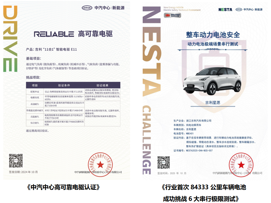 吉利星愿搭载行业首款11合1智能电驱,在功能高度集成的同时,还拥有同级领先的89.2%电驱效率,实现了同级最小的66L体积,将节省的空间以超大后备箱的形式还给了用户。通过了3000小时的台架耐久和200万公里的真实路试,星愿电驱完成了浸水工作、高温耐久、电磁抗扰、扭矩冲击、机械冲击等7大高难度挑战,获得了中汽研《高可靠电驱》的认证。