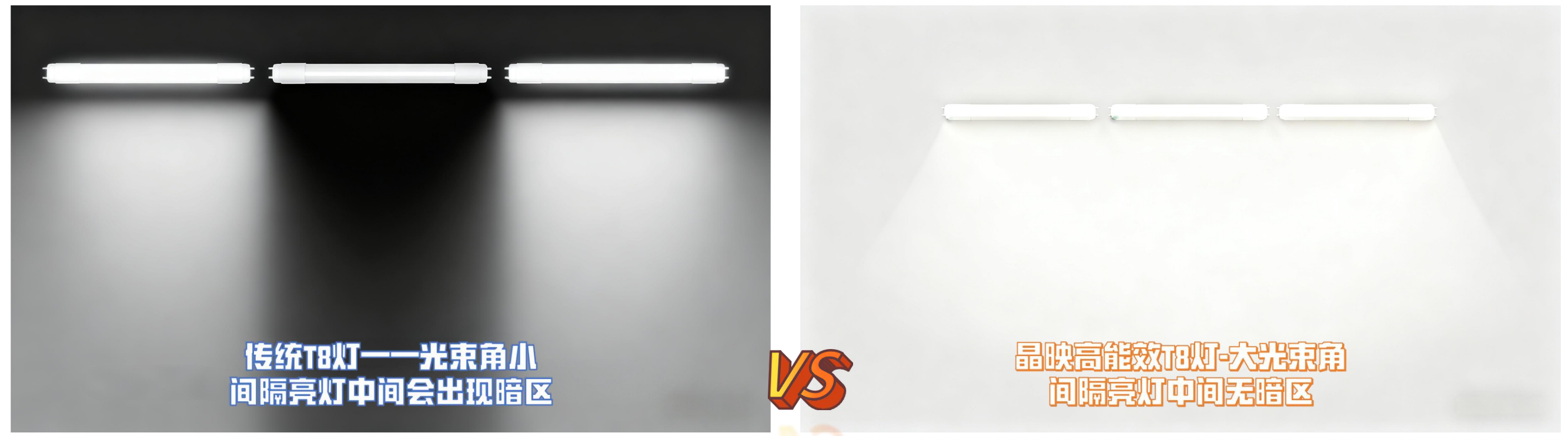 不同于竞品的聚焦式发光,晶映 T8 灯管的全发光设计属行业首创,从根源解决 “间隔亮灯” 的暗区问题。传统竞品靠外壳遮挡实现半发光,发光角度只有90度,遇遮挡光照效果骤降;而晶映 T8 采用全透设计,摒弃包裹外壳,即便支架有遮挡,实际发光角度仍达160度左右,覆盖范围远超竞品。