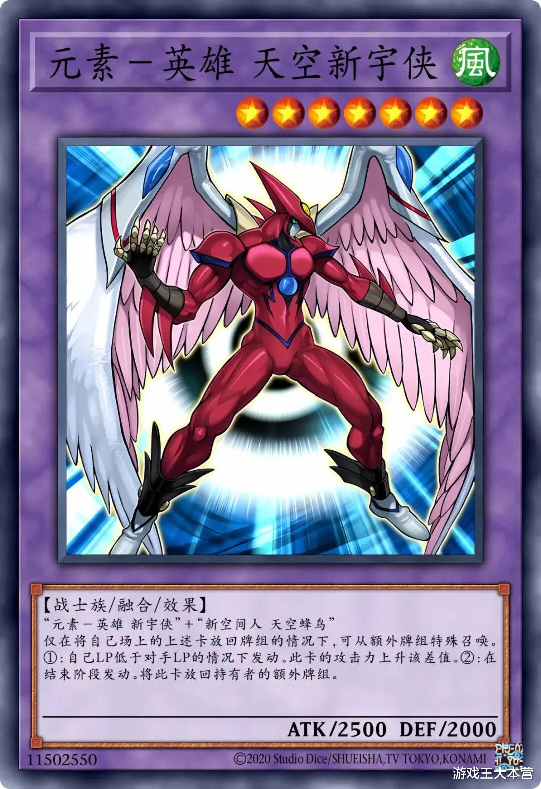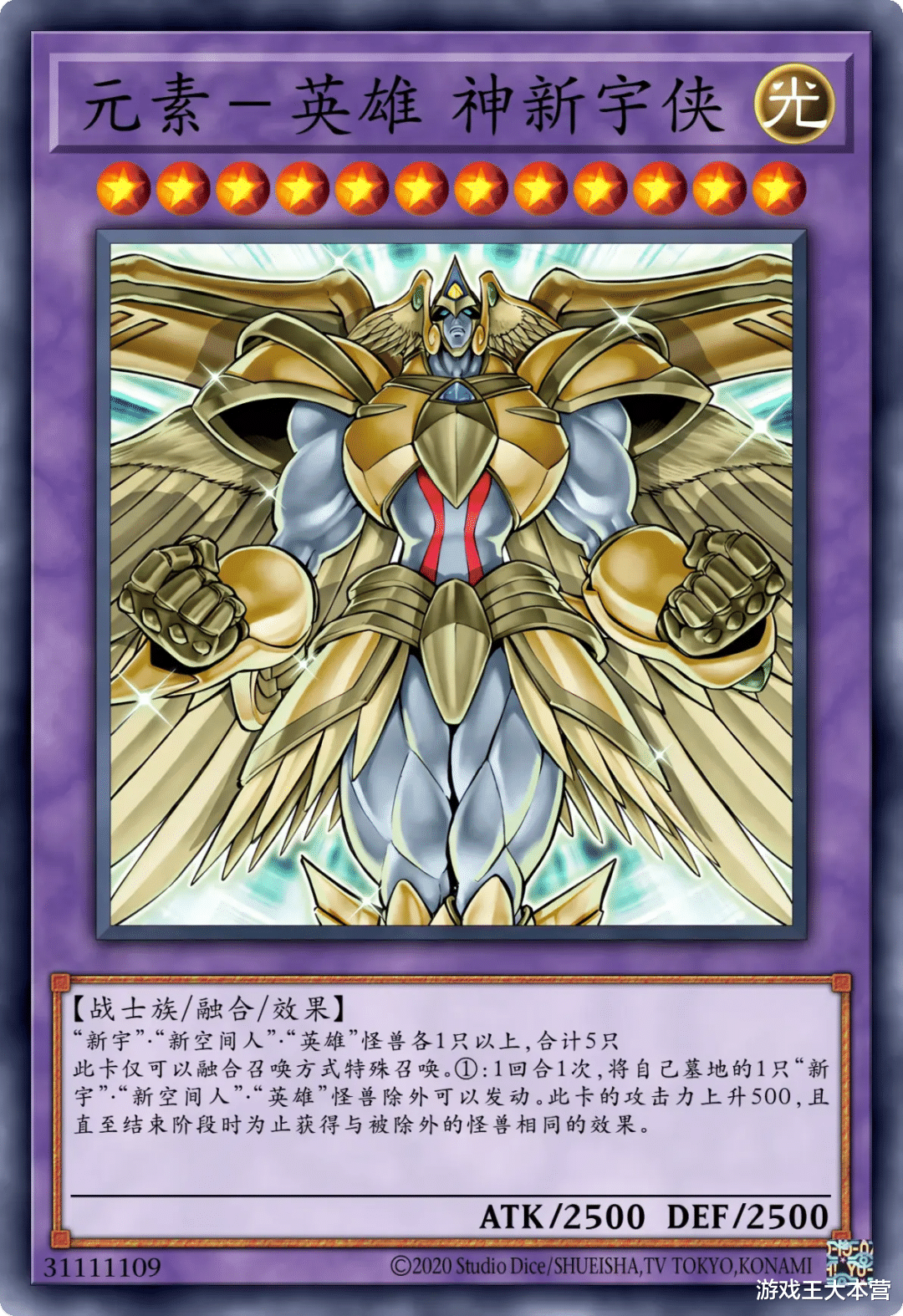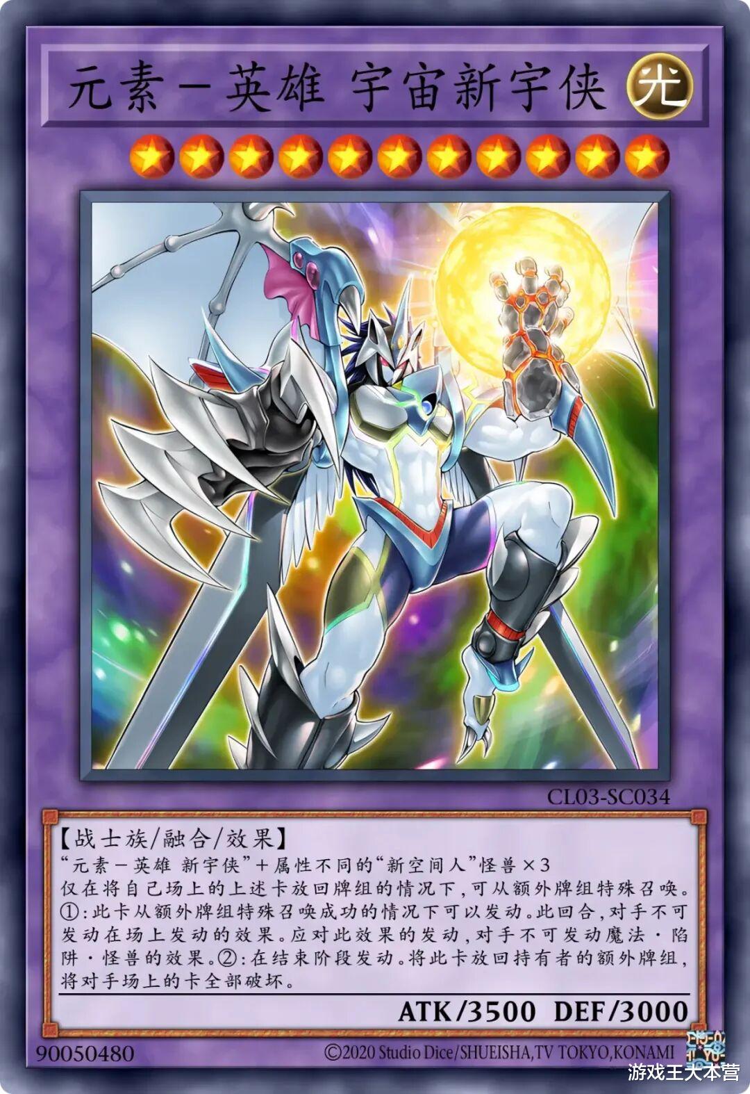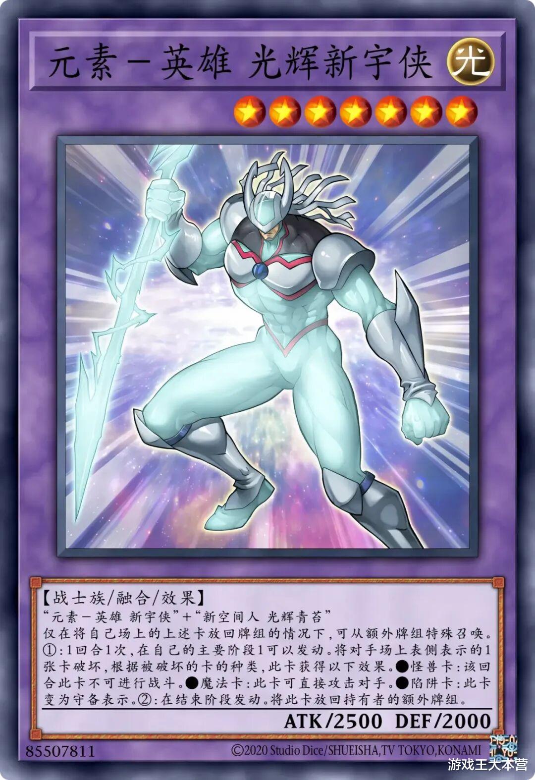 “新宇”.“新空间人”“英雄”怪兽各1只以上,合计5只此卡仅可以融合召唤方式特殊召唤。1回合1次,将自己墓地的1只“新宇”."新空间人”.“英雄”怪兽除外可以发动。此卡的攻击力上升500,且直至结束阶段时为止获得与被除外的怪兽相同的效果。