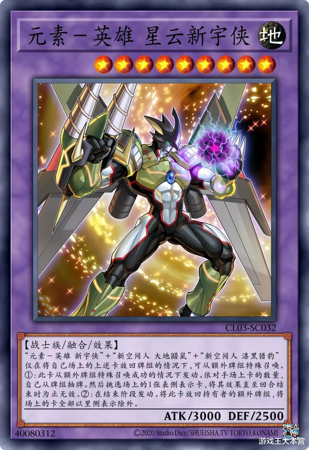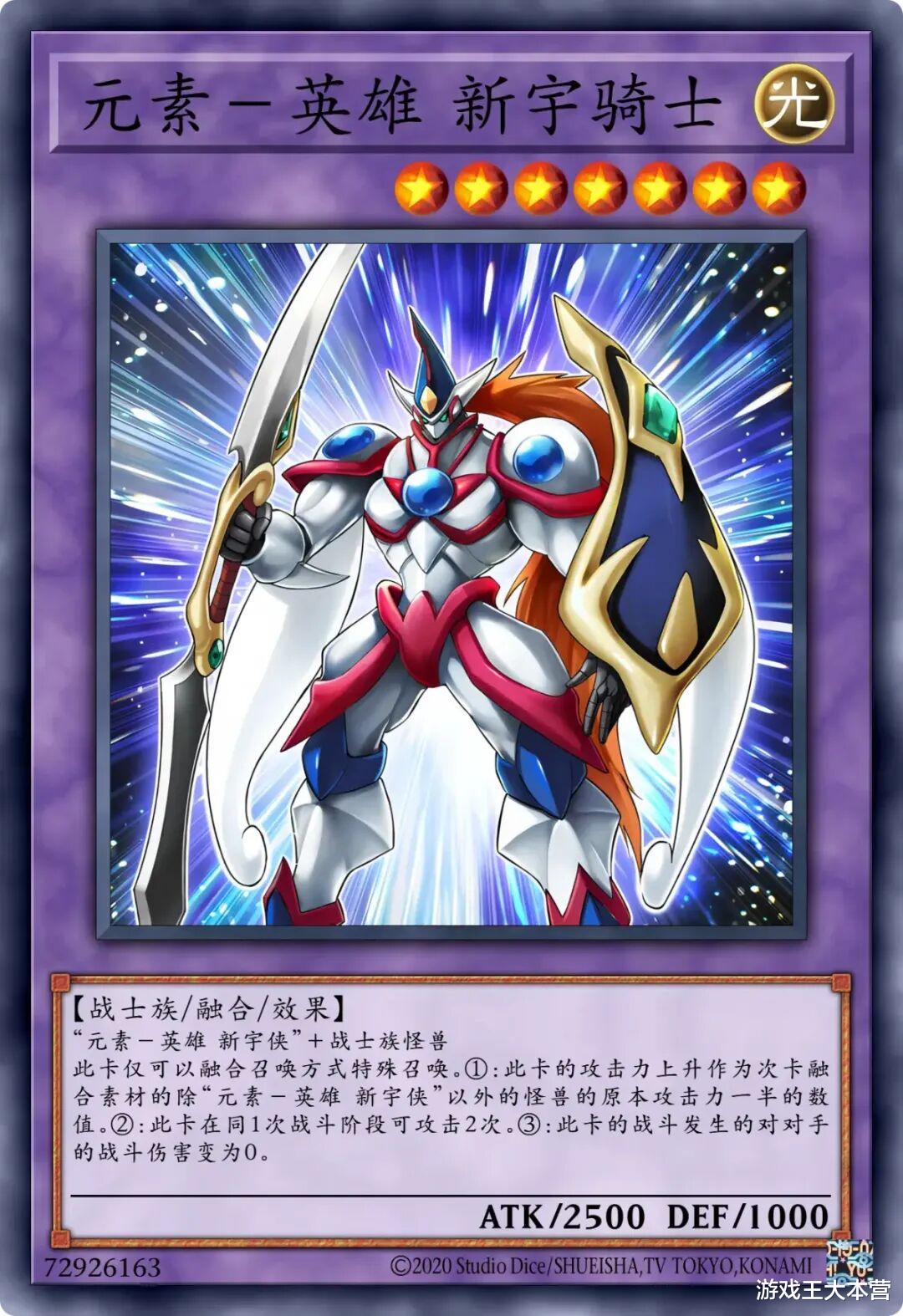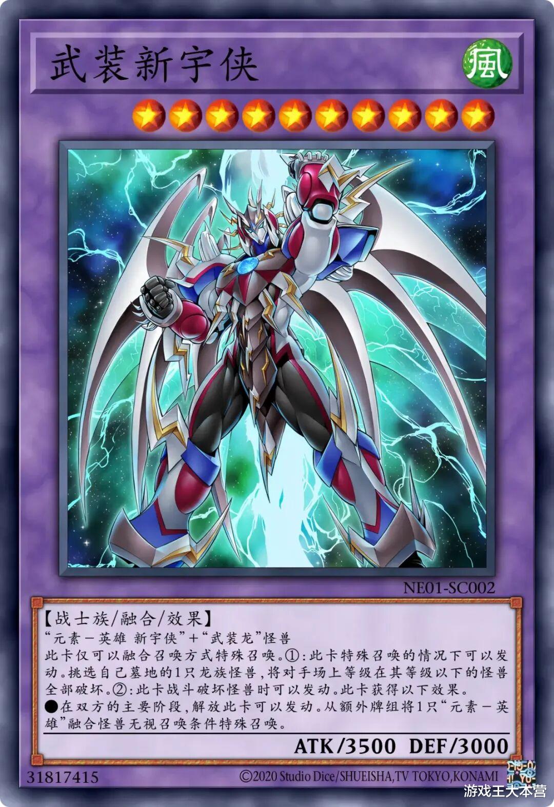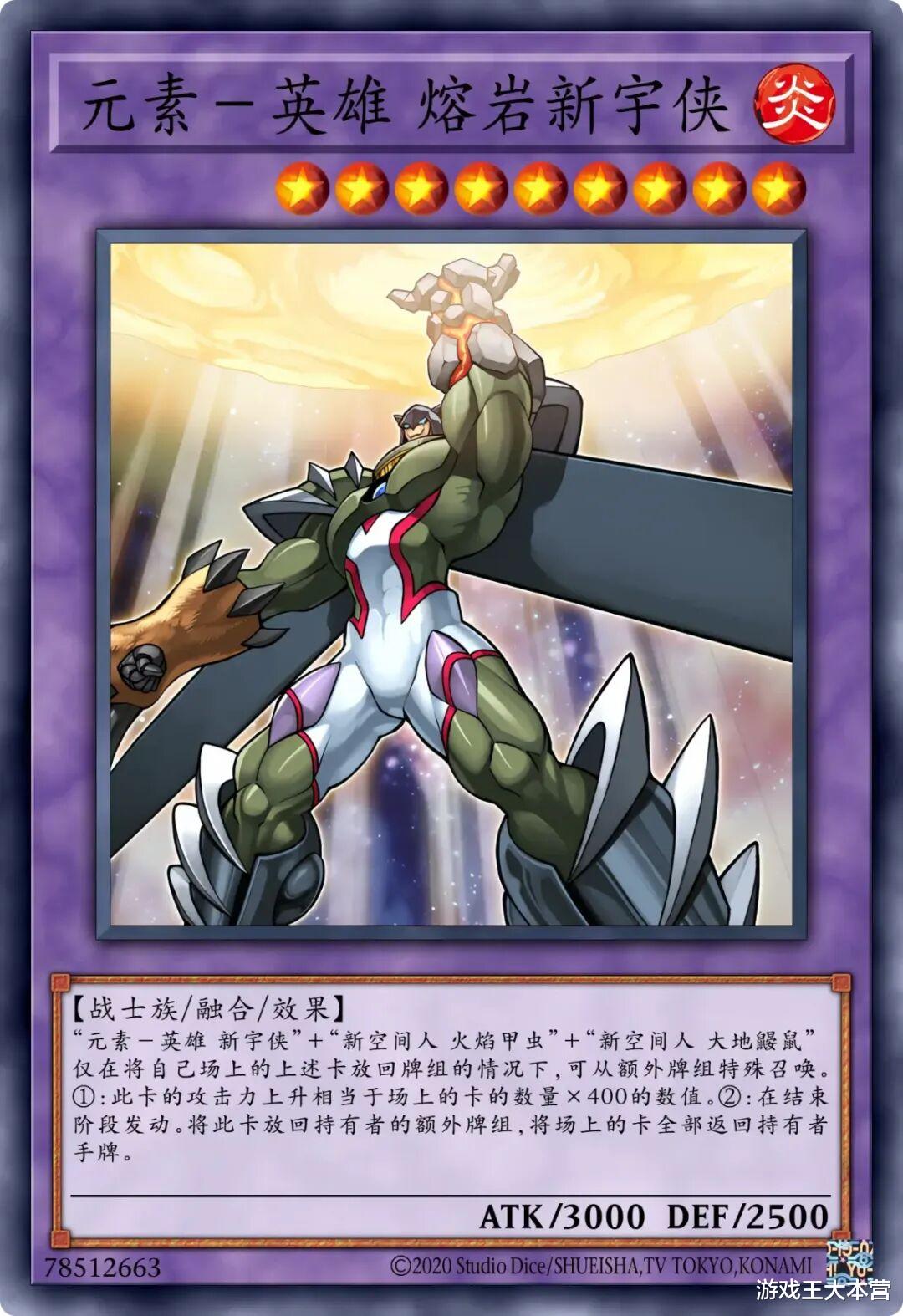 “新宇”.“新空间人”“英雄”怪兽各1只以上,合计5只此卡仅可以融合召唤方式特殊召唤。1回合1次,将自己墓地的1只“新宇”."新空间人”.“英雄”怪兽除外可以发动。此卡的攻击力上升500,且直至结束阶段时为止获得与被除外的怪兽相同的效果。
