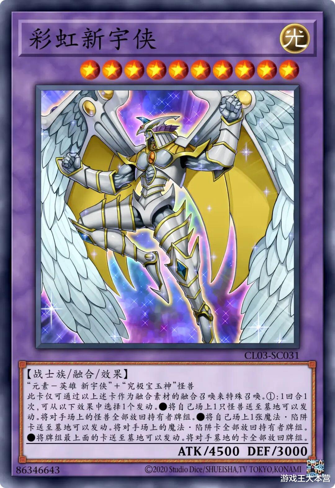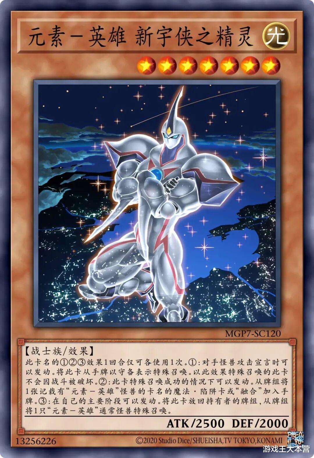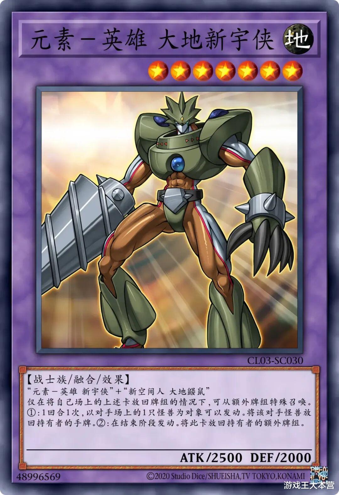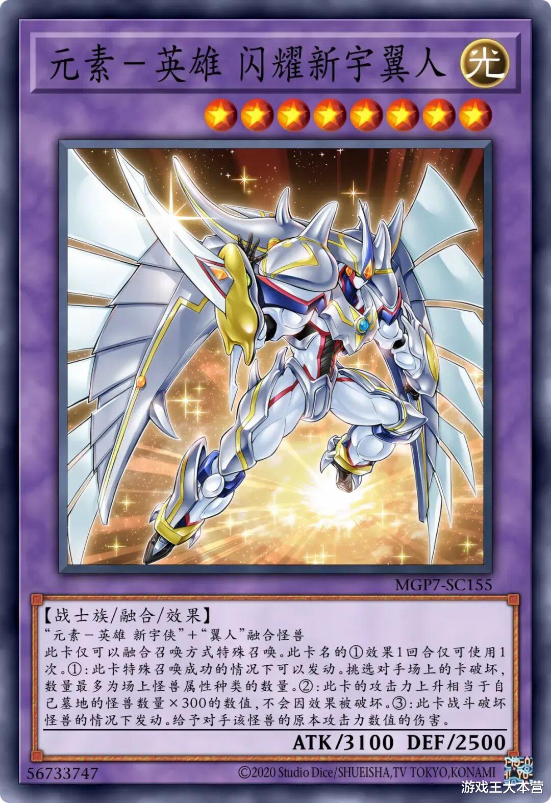 “新宇”.“新空间人”“英雄”怪兽各1只以上,合计5只此卡仅可以融合召唤方式特殊召唤。1回合1次,将自己墓地的1只“新宇”."新空间人”.“英雄”怪兽除外可以发动。此卡的攻击力上升500,且直至结束阶段时为止获得与被除外的怪兽相同的效果。