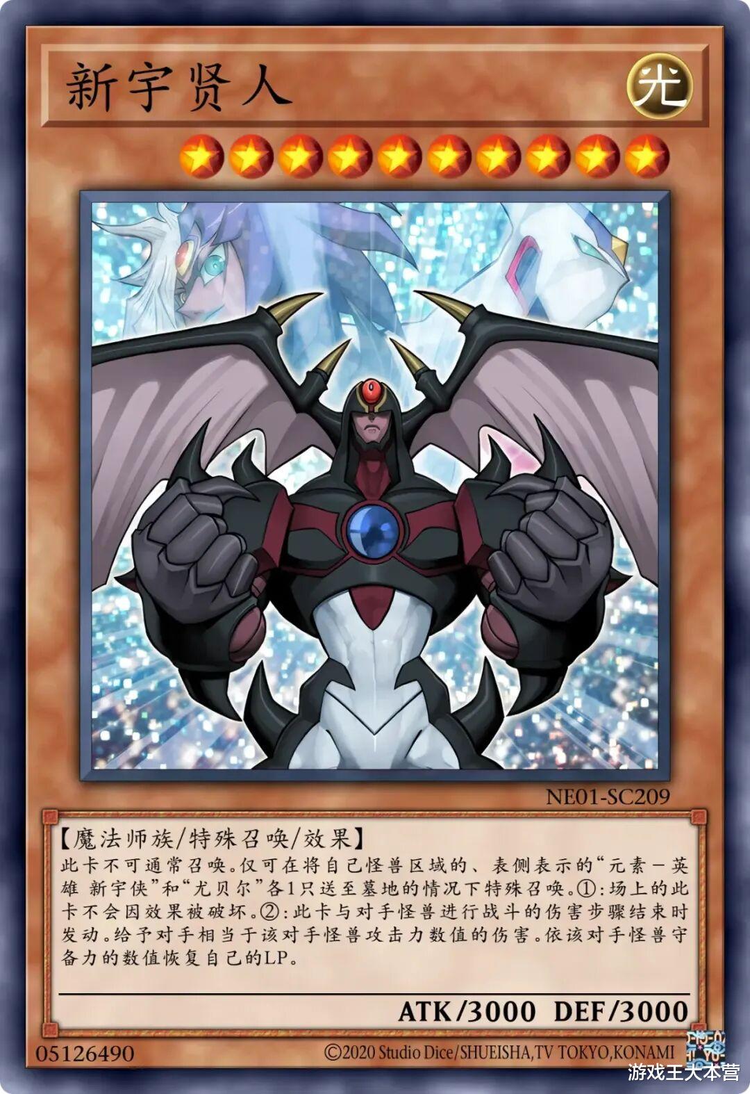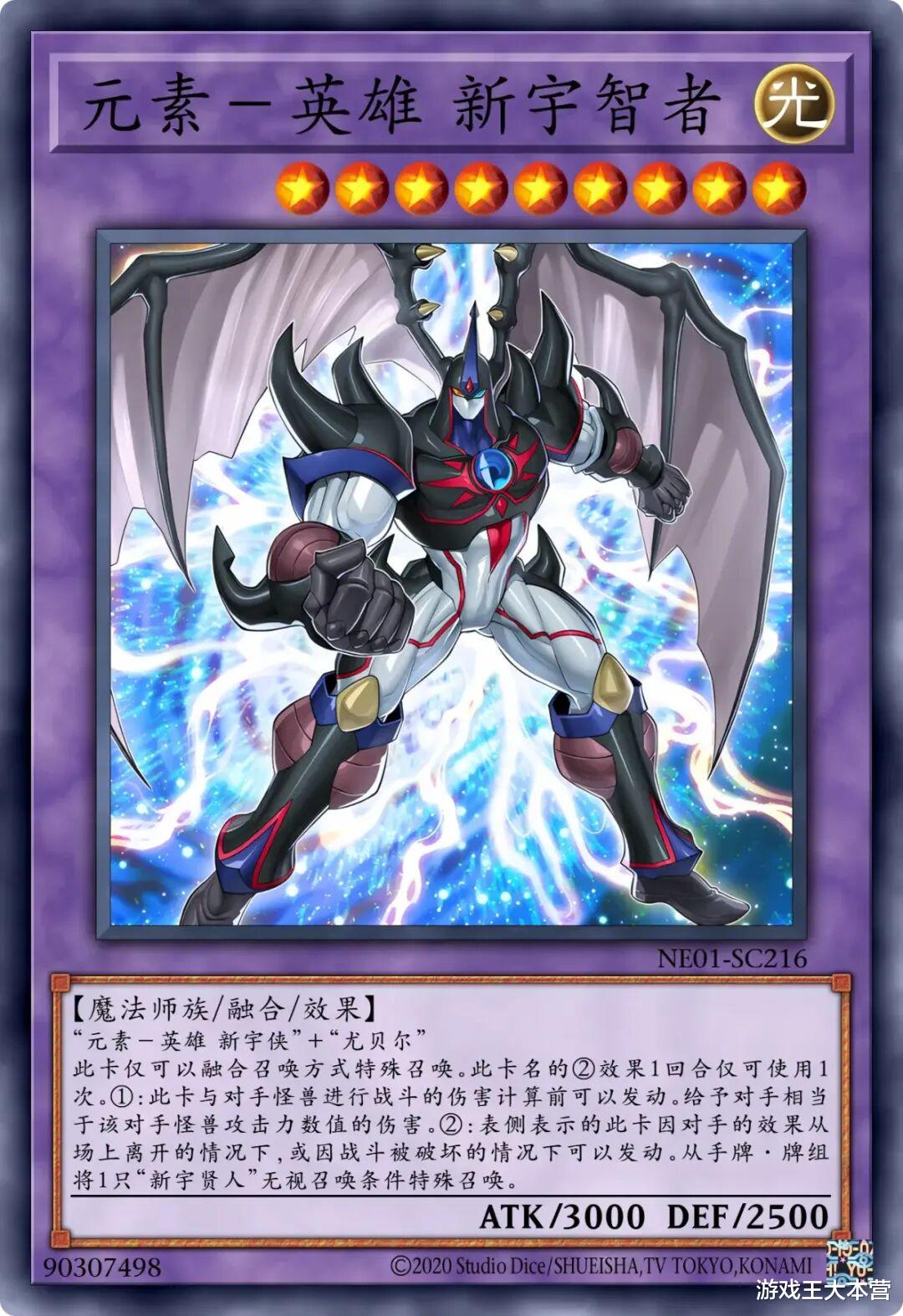 这张卡不能通常召唤。只有将自己的怪兽区的表侧表示的「元素英雄—新宇侠」和「尤贝尔」各1只送入墓地的场合才能特殊召唤。①:场上的这张卡不会被效果破坏。②:这张卡与对手怪兽进行战斗的伤害步骤结束时必定发动。给予对手那只对手怪兽的攻击力数值的伤害,自己的LP恢复那只对手怪兽的守备力数值。
