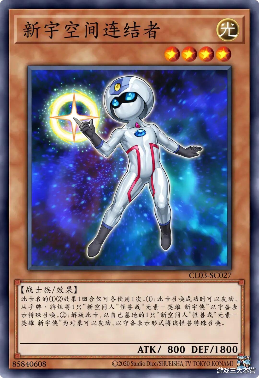 不依赖常规融合魔法卡即可完成额外卡组怪兽的召唤,在体系结构与战术逻辑上形成独立且完整的运作闭环。系列下级新宇宙侠怪兽均为低星级怪兽,属性覆盖地、水、炎、风、光、暗等常规属性,单卡效果偏向场面干扰、手牌控制、战斗辅助与自身特殊召唤,能够在对局中为核心怪兽登场提供铺垫。茧状体怪兽则作为新宇宙侠的前置形态,可在特定场地魔法支持下解放自身,从卡组或手牌特殊召唤对应属性的新宇宙侠怪兽。