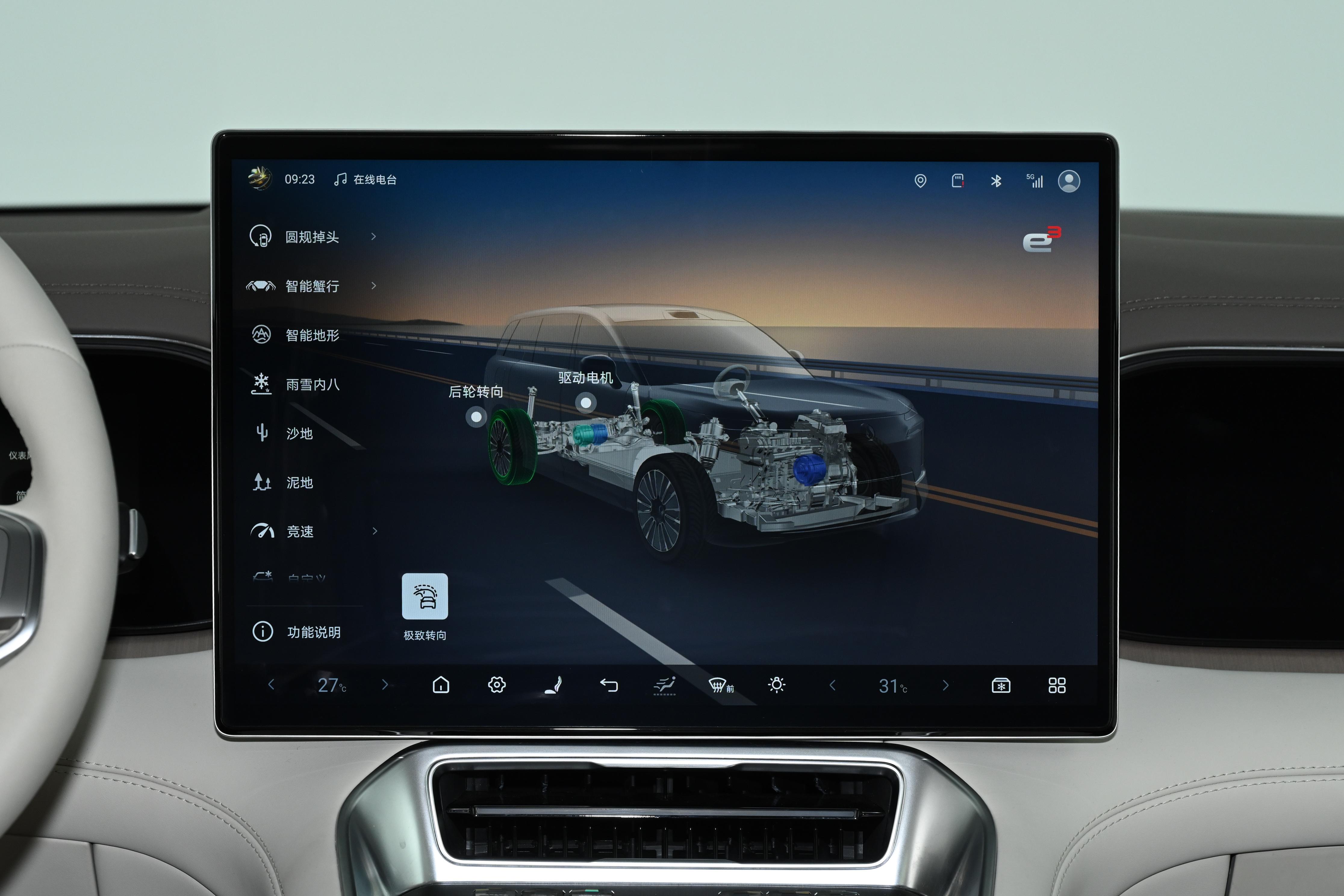 最让人惊喜的还是这款车在冰雪路面上的操控表现,这都得益于它搭载的易三方技术和三电机四驱系统。易三方技术中的“雨雪内八”模式真的很实用,开启这个模式后,后轮会呈现内八姿态,就像双板滑雪时的内八刹停原理一样,能有效提升车辆的防滑性能,防止溜车。我在积雪覆盖的市区道路上体验时,开启雪地模式和“雨雪内八”模式,车辆起步非常平稳,就算是轻踩油门也不会出现打滑的情况。在上下坡路段,系统能实时、独立地调整前后轴及左右轮的扭矩,实现精准的牵引力分配,上坡时动力输出平稳,下坡时也能保持车身稳定,完全没有失控的风险。