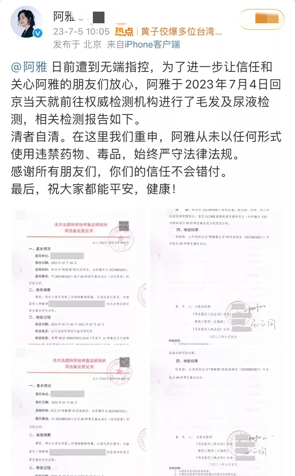 7月5日,阿雅直接冲上了热搜,受之前台湾主持人黄子侨爆料影响,阿雅前往北京相关部门做了检测,并以此来证明自己的清白。