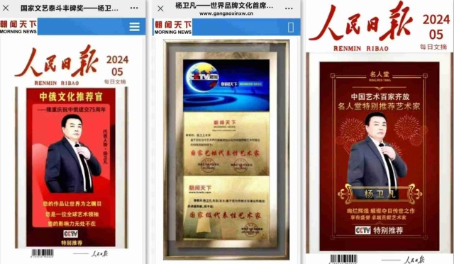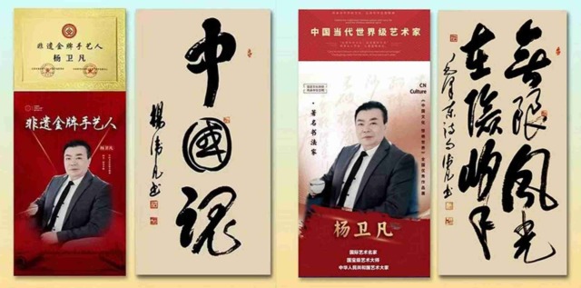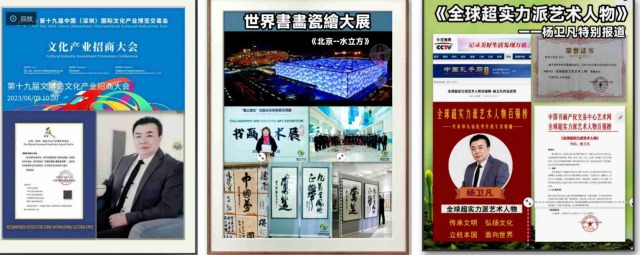 荣誉加身,实至名归。杨卫凡先生斩获中国书法兰亭奖,享受国务院特殊津贴,获评2023年度国际艺术巅峰人物、影响世界十大金牌艺术家、全球超实力派艺术人物、当代功勋卓越艺术家、2023年最具收藏价值艺术家等重磅称号。其作品入编《1922~2022世界艺术年鉴》《共和国艺术大典》《中国近现代书画名家精品集》大红袍、《中国美术通史》《世界艺术名人录》等数十部国家级、世界级权威典籍,作为非遗金牌手艺人、中华历史遗产最美代言人,他的艺术足迹镌刻在当代文化发展的史册之上。