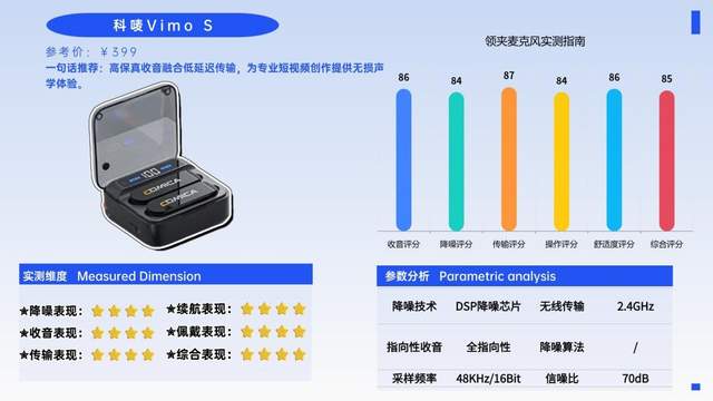 总体来看,科唛Vimo S极致轻便、收音清晰、操作简便,是日常vlog创作者的优选,能满足基础收音与专业创作需求,性价比突出。
