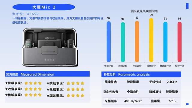 总体来看,大疆Mic 2专业功能全面、传输稳定、内录备份实用,适合预算充足的专业团队或商业创作者,能完美应对大型活动、商业广告等复杂拍摄需求。