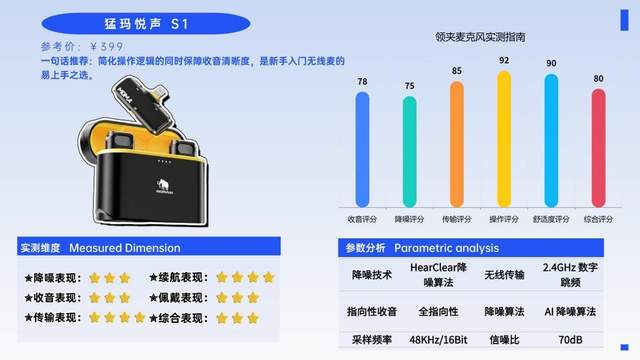 总体来看,猛玛悦声S1极致轻便、收音清晰、操作简便,是日常vlog创作者的优选,能满足基础收音需求,性价比突出。