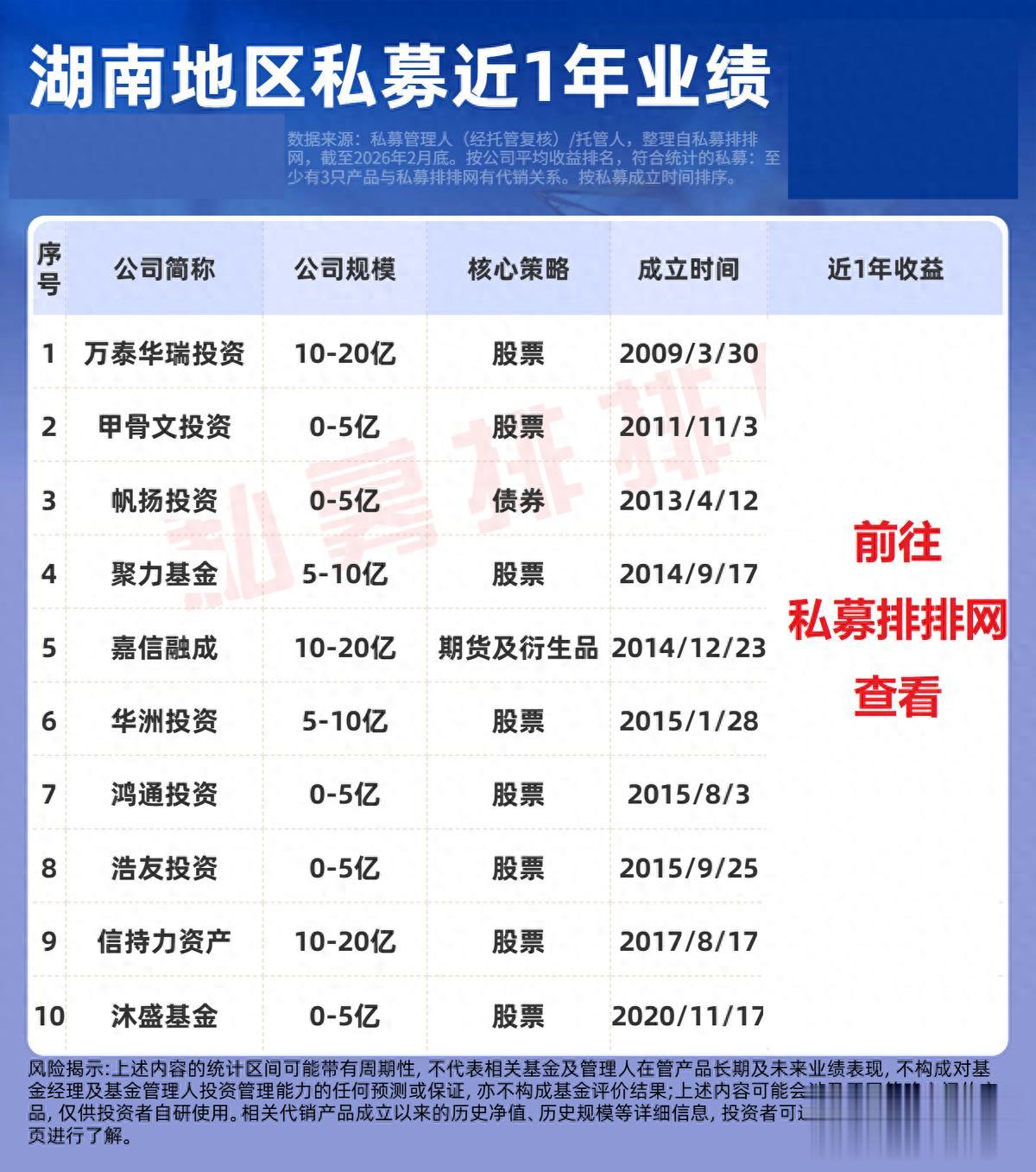 以上就是对“湖南私募基金公司有哪些?湖南私募基金公司一览”的相关介绍,需注意的是,以上信息不构成任何基金推荐或投资建议,市场有风险,投资需谨慎。想了解更多投资理财知识资讯,请关注私募排排网。