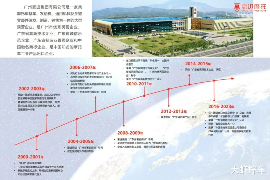 广州豪进集团成立于2001年,是一家集摩托车整车、发动机、通用机械及关键零部件研发、制造、销售为一体的大型民营企业。集团拥有建筑面积达20多万平方米的国际一流摩托车工业园区,具备年产摩托车整车和发动机各100万台的生产能力。在技术研发方面,豪进集团先后与博世、德尔福等的业内知名企业和研发机构合作,并具备先进的CAD和CAE计算机辅助设计、QAD ERP供应链管理等信息化系统的高度应用和集成。