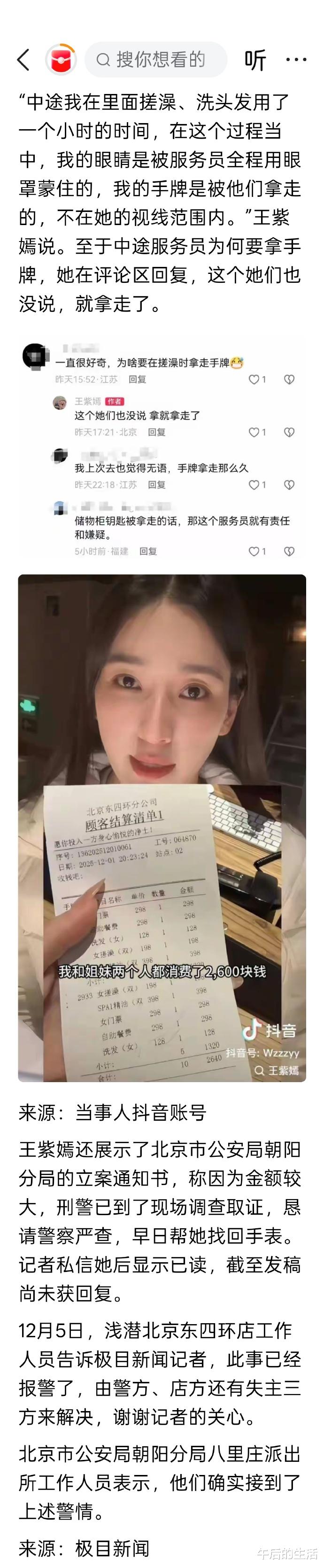 14万劳力士"蒸发"之谜:东四环洗浴中心储物柜离奇失窃案  北京姑娘王紫嫣在2023年12月1日遭遇的这场"本命年劫难",至今仍让无数网友揪心。这位来自天津的游客在浅潜北京东四环店经历的离奇失窃事件,不仅涉及巨额财物损失,更牵扯出高端服务场所的安保漏洞之问。