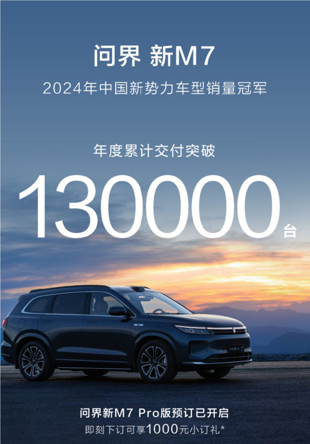 各方面实力不俗,所以问界新M7才会卖这么好。我才在手机上刷到的官方消息,问界新M7年度累计交付已经突破了13万台,稳坐新势力车型销量冠军的位置。更关键的是问界新M7 Pro版本已经开启了预售,预售价24.98万起,下订还有1000元小订礼,整体的性价比非常不错。本身市场认可度和接受度就高,门槛降低后销量估计还会再提升,问界新M7的“国民SUV”地位又要加强了。