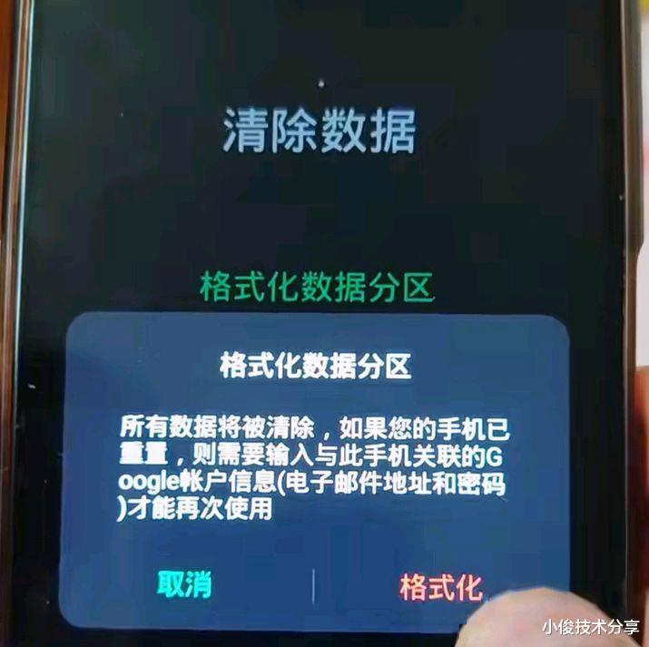 一旦选择了,手机就会出现,所有数据将被清除并格式化的提示,这也意味着,只要我们选择了格式化数据分区,手机里面的所有数据都会被清空。