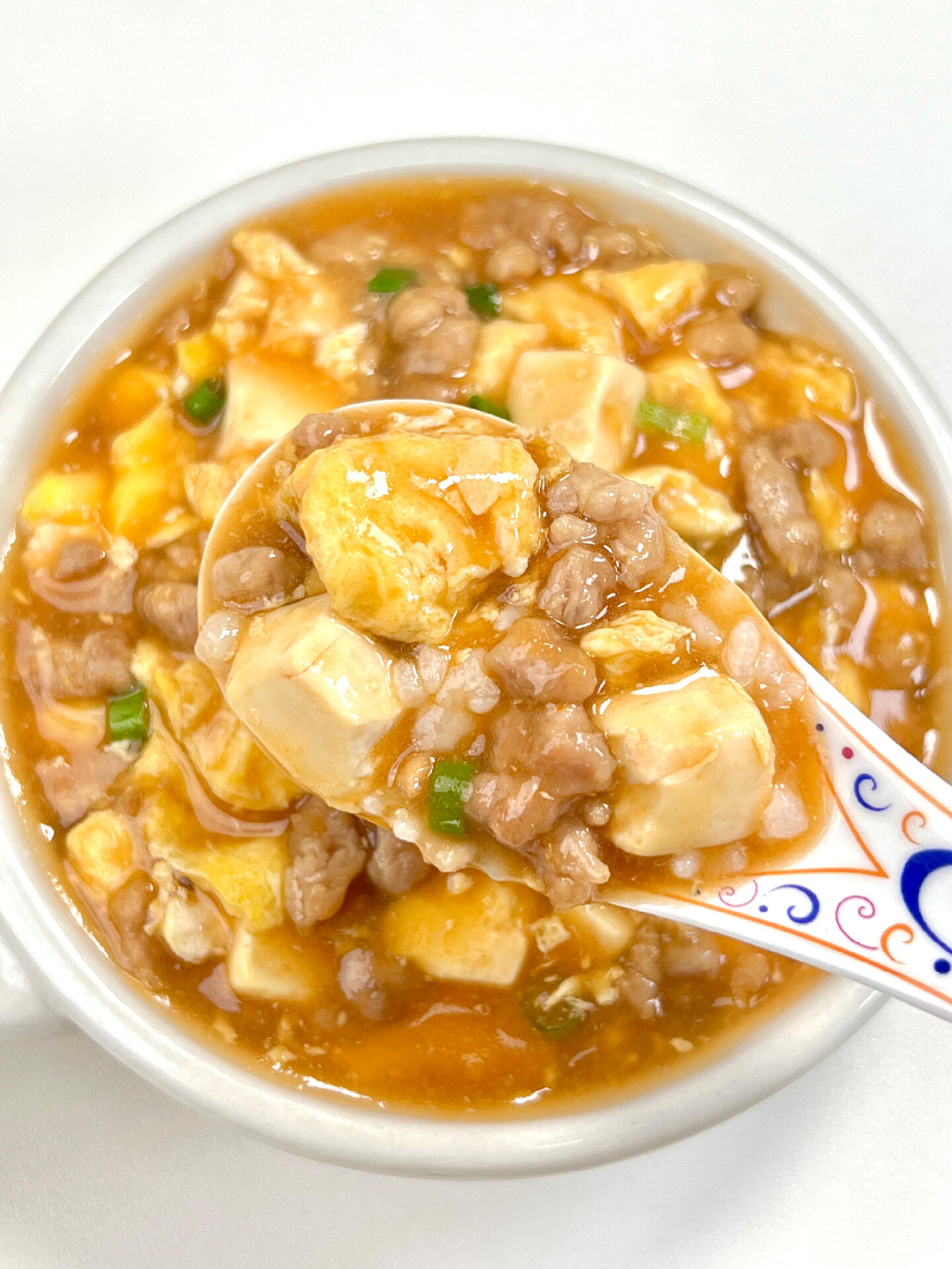 把调好的酱汁沿着锅边倒进去。酱汁遇热很快变得浓稠,“咕嘟咕嘟”冒着泡,红亮的颜色特别诱人。再把炒好的肉末倒回去,用铲子轻轻滑动,让肉末和酱汁、鸡蛋豆腐混合均匀——动作一定要轻,豆腐嫩,翻重了容易碎。煮到汤汁浓稠,能挂在豆腐上,就可以关火了。最后撒一把葱花,翠绿的颜色点缀其间,红黄绿白,光是看着就让人食欲大开。