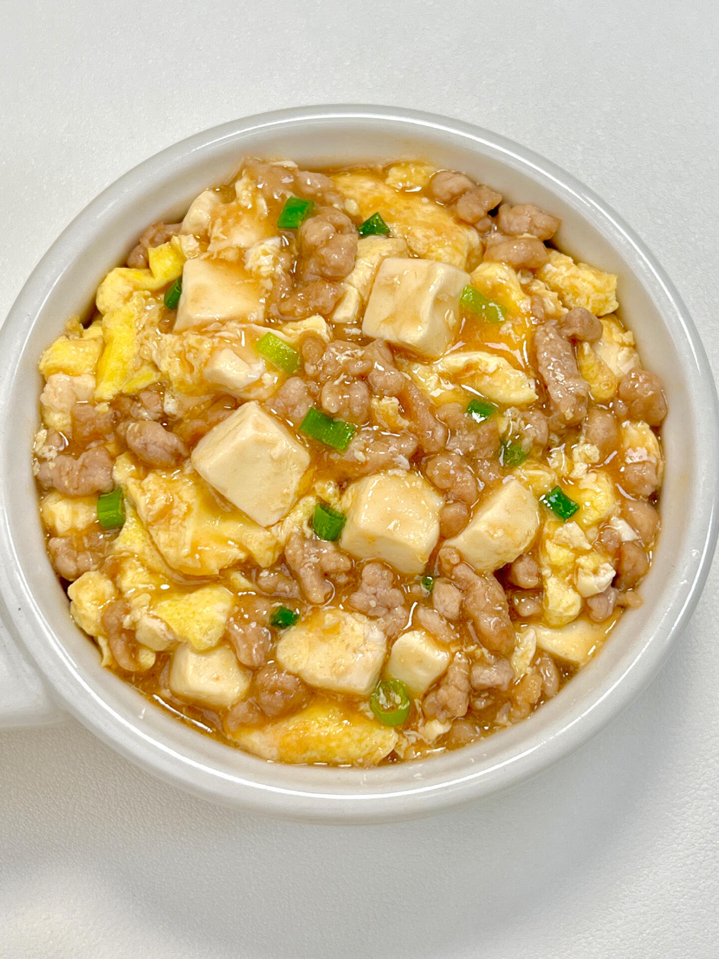 盛出来,红亮的酱汁裹着金黄的鸡蛋和雪白的豆腐,肉末和葱花点缀其中。舀一勺放在米饭上,拌一拌,米饭立刻染上诱人的颜色——那种红亮亮的酱汁渗进米粒里,看着就知道宝宝会喜欢。