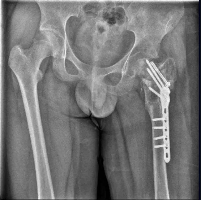 小武左股骨陈旧性骨折,打了钢针、钢板 图据受访人