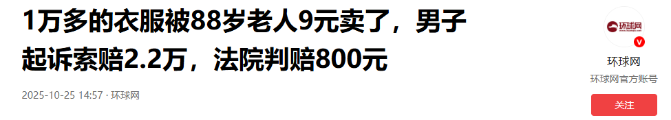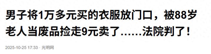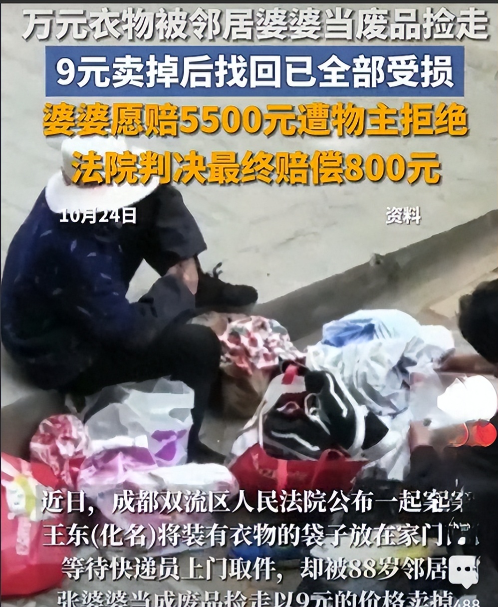 查了快俩小时,才发现拿走衣服的是同栋楼 3 楼的张婆婆 ——88 岁了,平时就有捡点废报纸、空瓶子补贴家用的习惯。张婆婆后来跟民警解释:“我路过他家门口,看那袋子敞着口,里面的衣服叠得不算整齐,以为是人家不要的旧衣服,就跟我家攒的废纸箱捆一块,送到小区门口的废品站了,一共才卖 9 块钱,我真不知道那衣服那么贵。”