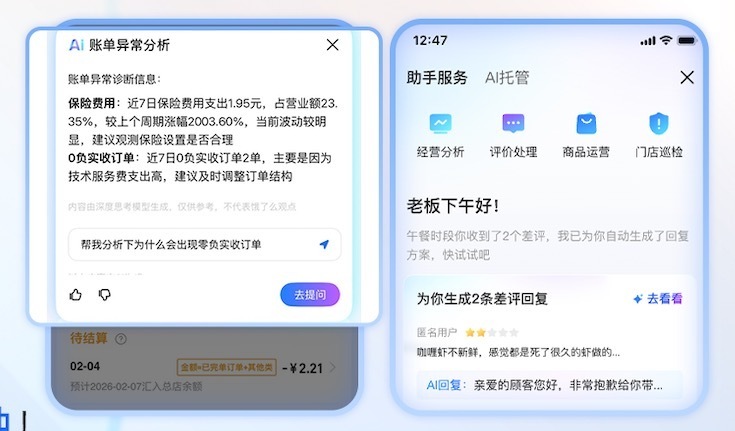 目前,AI 店铺助手主动服务体系在助手首页、全局气泡以及和垂直场景联动的自嵌入AI悬浮窗等多场景支撑。服务涵盖履约、营销活动、经营成长、账单分析、顾客评价等多形态场景,覆盖商家规模已超百万。