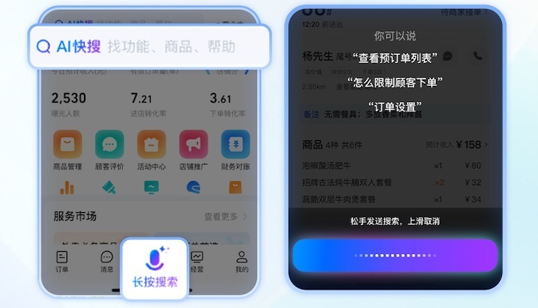 “帮我下架这个套餐……”经营高峰时突遇商品库存不足需要下架,以往商家操作至少需要5步点击,有了AI搜问,商家现在只需一句话即可直接调起执行窗口。语音一问,AI就能帮助餐饮老板高效搞定订单查询、商品管理、屏蔽恶意顾客等指令。功能测试以来,开发票、屏蔽恶意顾客、搜商品等成为商家高频搜索使用场景。