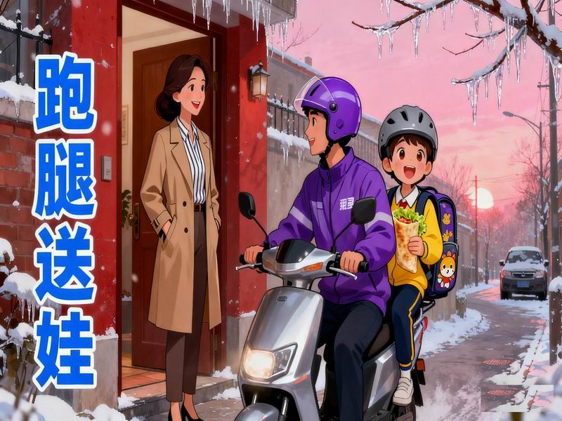 想象这个画面:跑腿小哥给孩子裹紧羽绒服,孩子背着书包坐在电动车后座啃煎饼,两人在晨光中等红绿灯时可能还在讨论昨晚的动画片。这场景难道不比妈妈一边开车一边焦虑地盯着时钟,孩子在副驾驶感受着低气压更温馨吗?当我们质疑“孩子心里咋想”时,或许孩子正为不用听妈妈唠叨“快点吃早饭”而偷着乐呢。