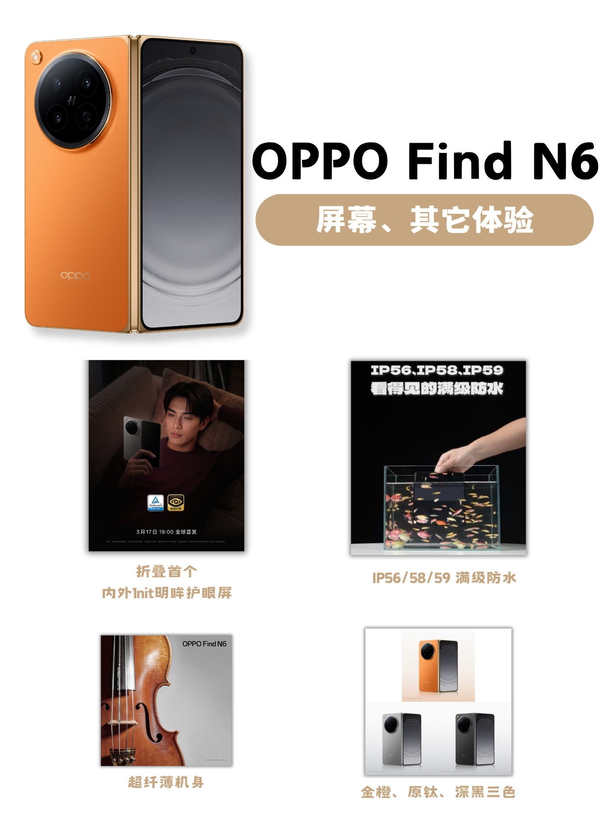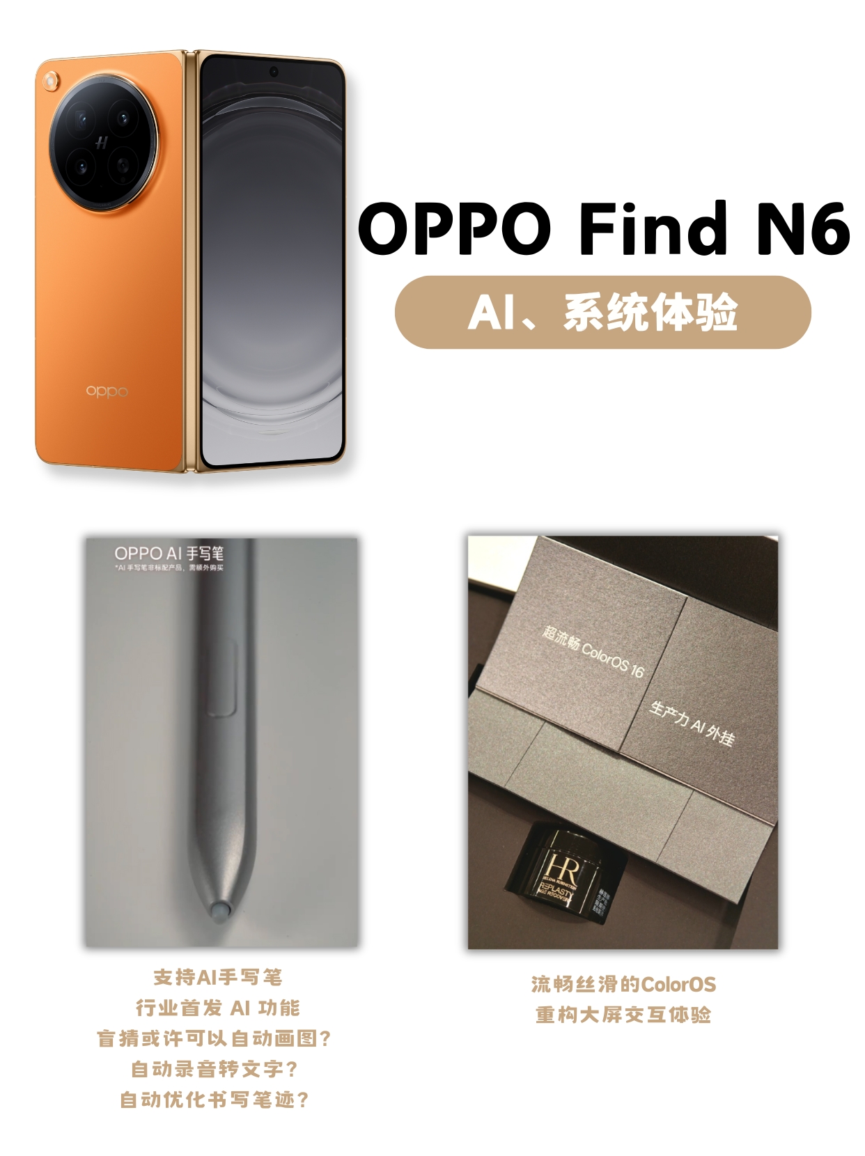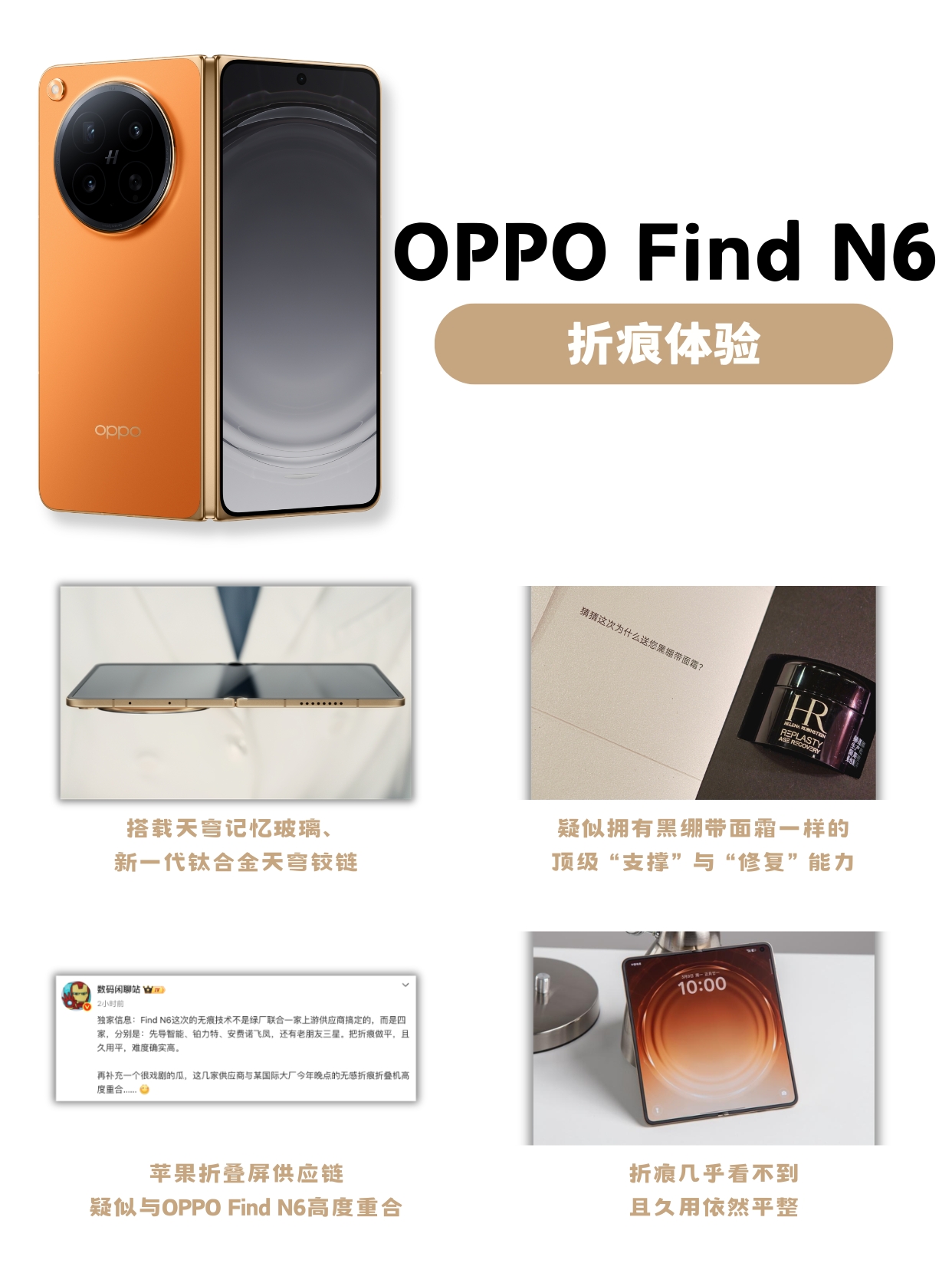 纯手工!帮你们将OPPO Find N6最近的爆料都汇总起来了。其中zui多人关注的应该是折痕体验了,联系发布会邀请函附赠的黑绷带面霜,我才这次OPPO Find N6的「新一代钛合金天穹铰链」和「天穹记忆玻璃」的“支撑”和“修复”效果应该像黑绷带一样顶级,从而带到几乎看不到折痕的效果。