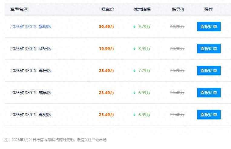作为德系中大型MPV,威然凭借3180mm超长轴距、2.0T+7DCT黄金动力组合,兼顾家用舒适与商务体面。此次调价后,380TSI旗舰版从40.28万指导价降至30.49万,直降近10万;入门款330TSI商务版下探至19.99万起,以合资旗舰身份杀入20万内价格带,性价比拉满。