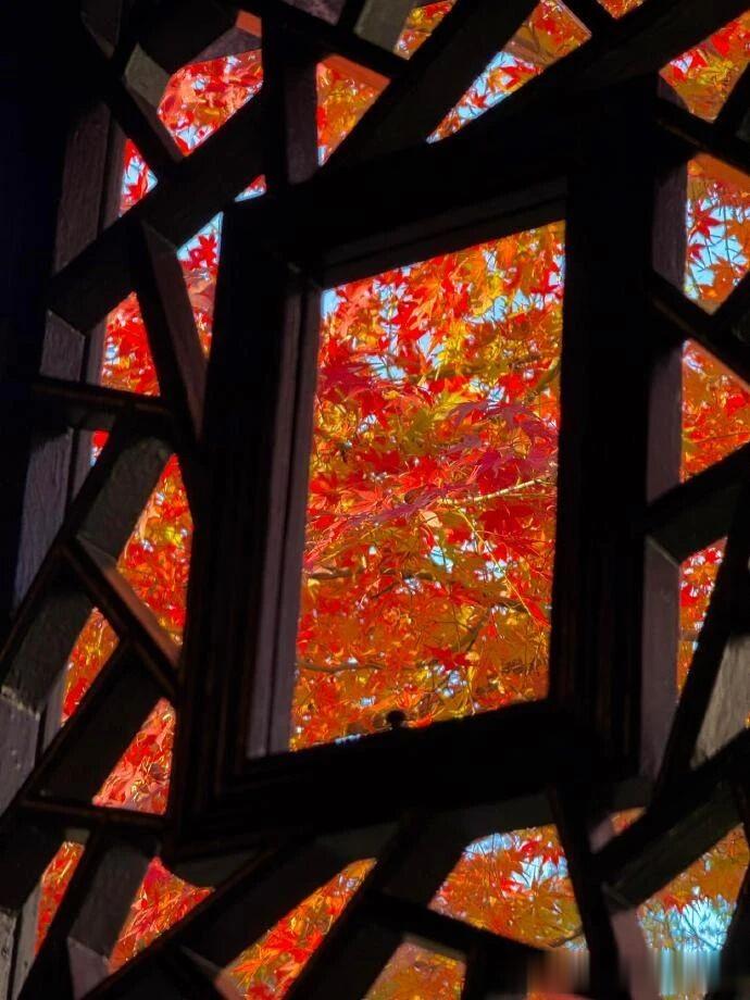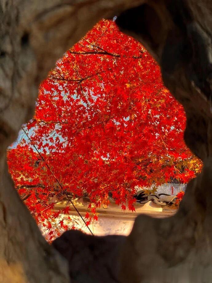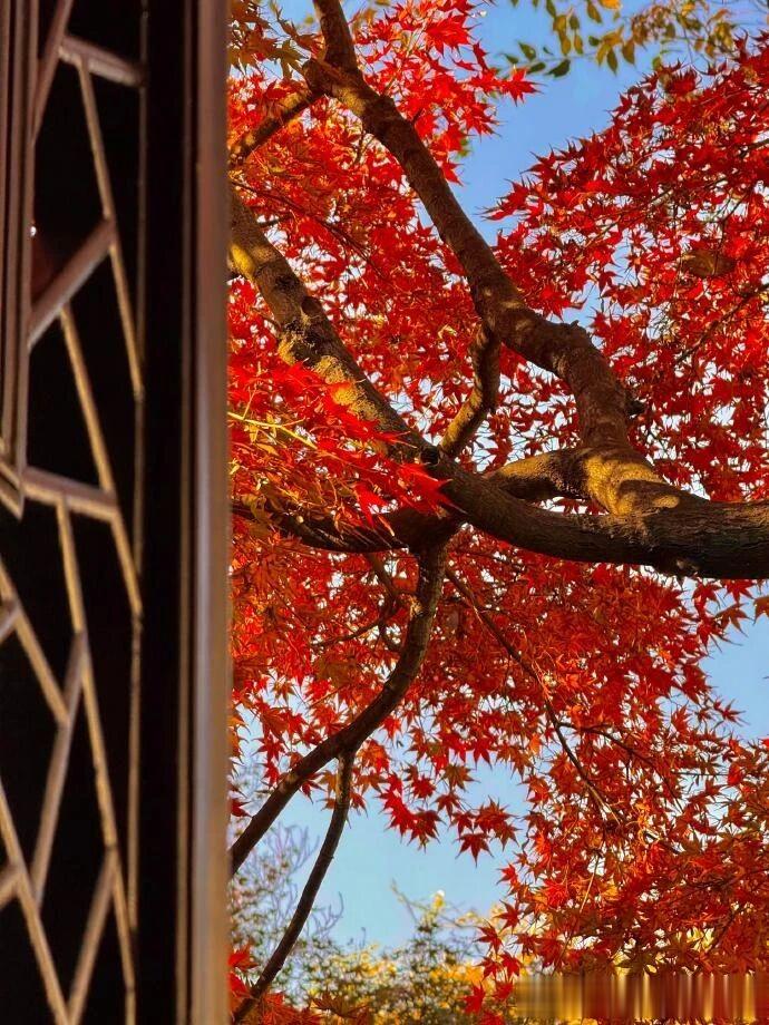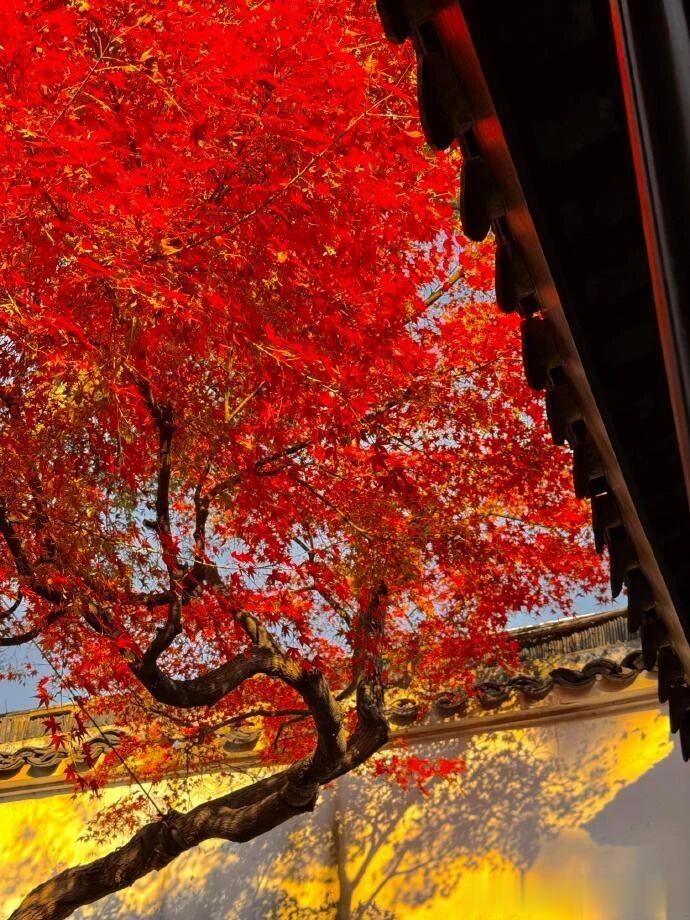 推开门窗,便看到满树都是火红的枫叶,与中式的窗户,屋檐相互映衬,这一切都宛如诗中描述的那般美好。