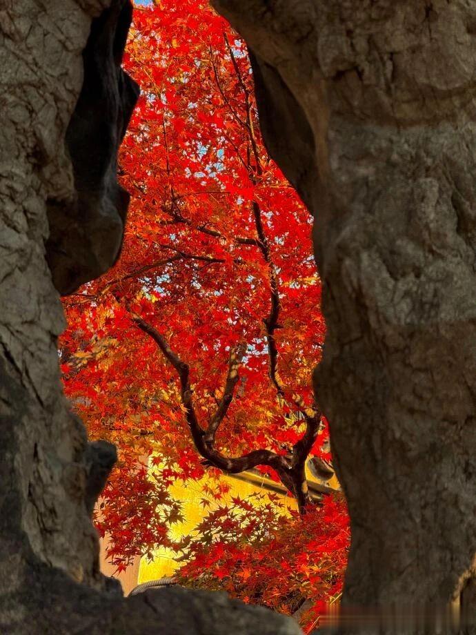 利用周围环境的“框架”,将枫叶放进框架里,一下子就能抓住观众的眼球。比如说,利用石头与石头之间的缝隙,门窗等。暗色系的石头,门窗,配上亮色系的枫叶,照片一下子就有了亮点。