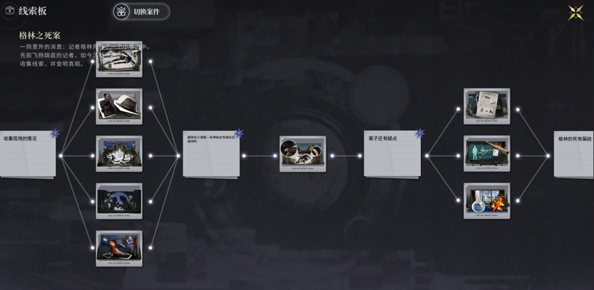 在调查案子的过程中,侦探会收集到现场证据、证人证词等线索,通过线索板来将其进行整合,得出最符合逻辑的结论。比如主线剧情里,面对“证人目击到活着的受害者被纵火焚烧、现场留有受害者的遗物”这样的铁证,侦探还是可以从“有其他在场者遇到了奇怪的人、死者尸检有异、现场发现了能作为阻燃剂的泥浆”这些证据里,推断出死者另有其人,而李代桃僵的受害者搞这一出的背后可能是另一个阴谋。