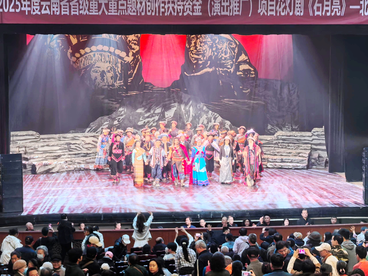 非遗不是博物馆里的静态陈列,而是流淌在时光里的活态文化。传统戏曲作为非遗的重要载体,承载着民族的记忆与审美,却在快节奏的当代生活中逐渐被大众疏离。为推动非遗活态传承,搭建传统文化与大众的沟通桥梁,北京观古鉴古文化传媒公司组织公司成员及部分非遗会员,走进北京民族文化宫大剧院,沉浸式观看2025年度云南省省级重大重点题材创作扶持资金(演出推广)项目——花灯剧《石月亮》,在视听盛宴中感受非遗戏曲的魅力,体悟传统文化的深厚底蕴。