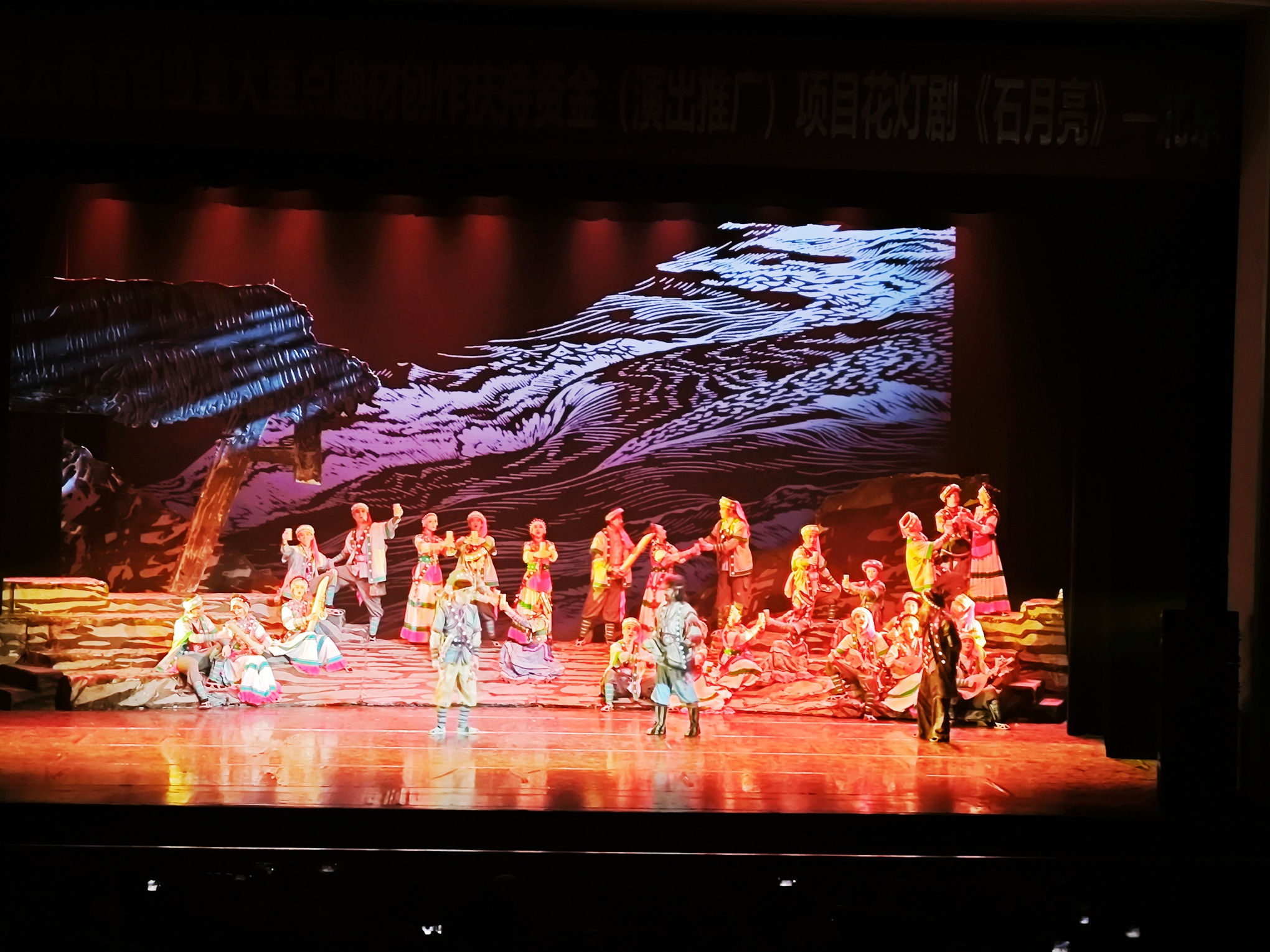 活动当天,北京民族文化宫大剧院内座无虚席,北京观古鉴古文化传媒公司成员及非遗会员有序入场,怀着期待的心情等待演出开始。随着灯光渐暗,舞台上的石月亮缓缓亮起,悠扬的花灯曲调响起,《石月亮》正式拉开帷幕,瞬间将现场观众带入怒江大峡谷的神秘世界。