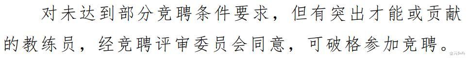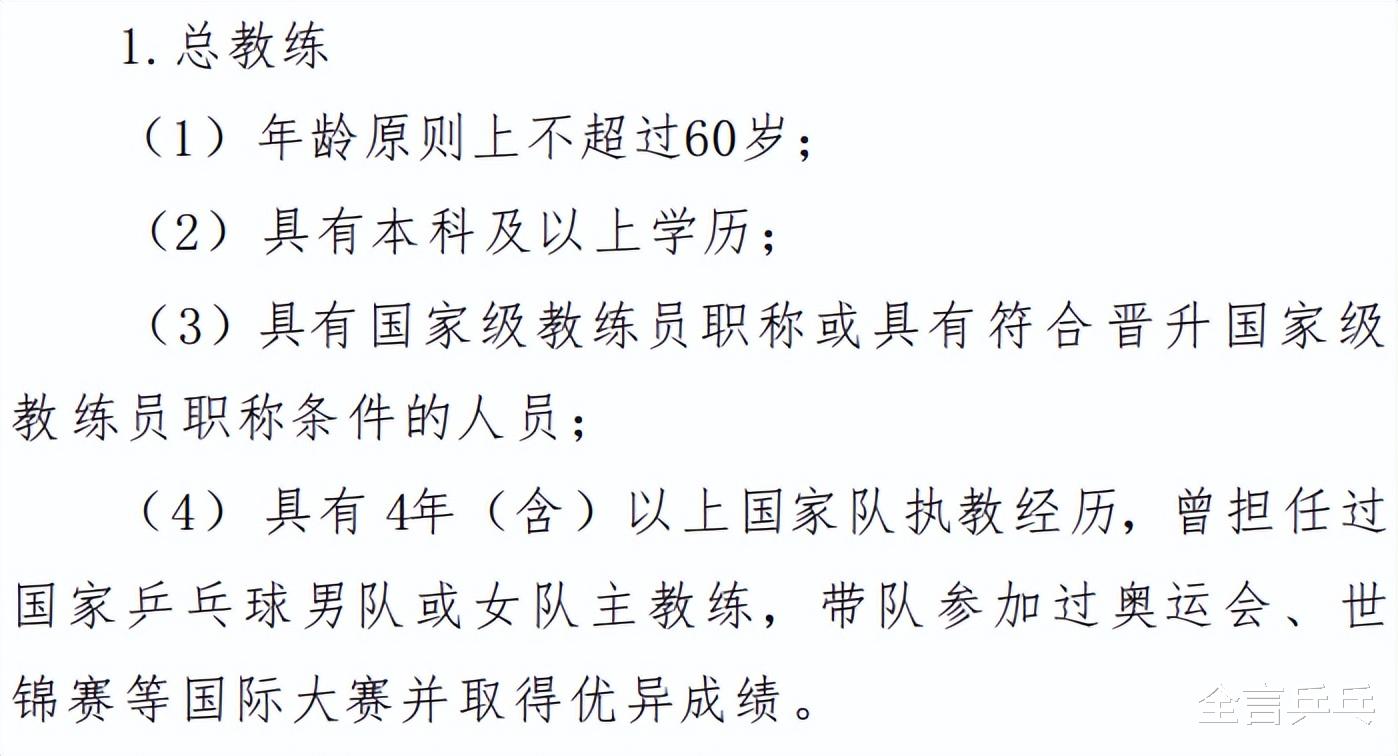 不过值得一提的是,在中国乒协公布的《洛杉矶奥运周期国家乒乓球队教练员竞聘工作方案》中还出现了这样一段话,那就是:“对未达到部分竞聘条件要求,但有突出才能或贡献的教练员,经竞聘评审委员会同意,可破格参加竞聘。”
