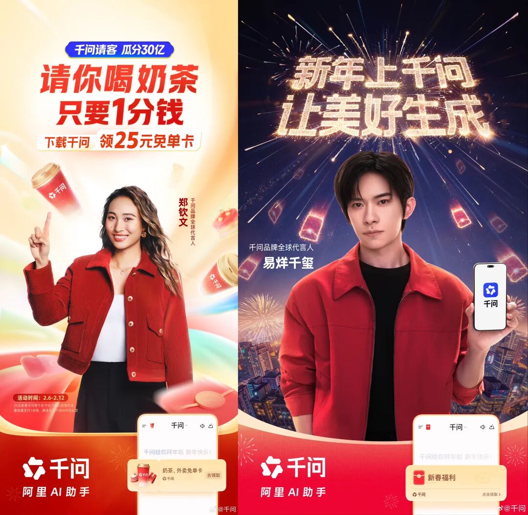 上个月,千问官宣全球品牌代言人郑钦文后,本月又官宣易烊千玺为全球品牌代言人。
