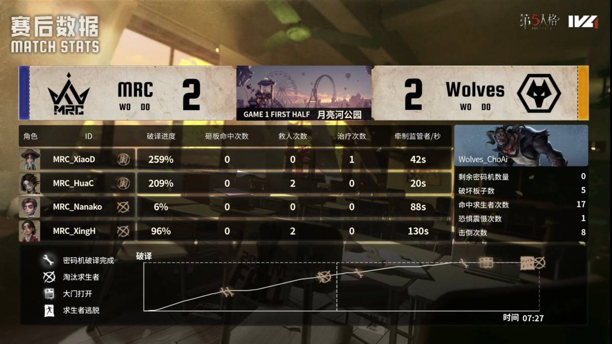 成都Wolves的求生者选择了火灾调查员、幸运儿、杂技演员、佣兵(BAN“跛脚羊”);MRC的监管者BaiLu选择了“喧嚣”。(BAN先知、飞行家、前锋、“逃脱大师”)