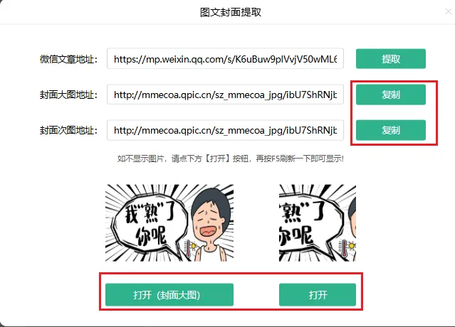 4. 提取后可直接复制图片链接保存,也能点击「打开」预览图片,确认无误再存。