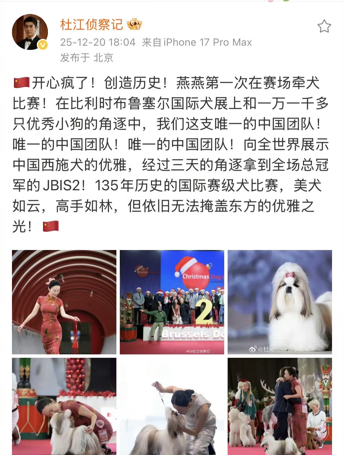 比赛一共比了三天,规矩特别多,要看狗的体态、步态,还得看服从性。霍思燕牵着“珍珠”在场上走的时候,那场面还挺特别,她穿着一身红色的旗袍,带着东方的古典美,而“珍珠”呢,作为中国原生的西施犬,长得像个小狮子,步伐特别稳。最后““珍珠”先拿下了西施犬这个品类的冠军,接着又一路过关斩将,拿下了全场总冠军JBIS2。这是中国原生犬种第一次在这个百年赛事里拿到这么高的荣誉,杜江在微博上激动得连发了好几条,反复强调“唯一的中国团队”,那种自豪感隔着屏幕都能感觉到。