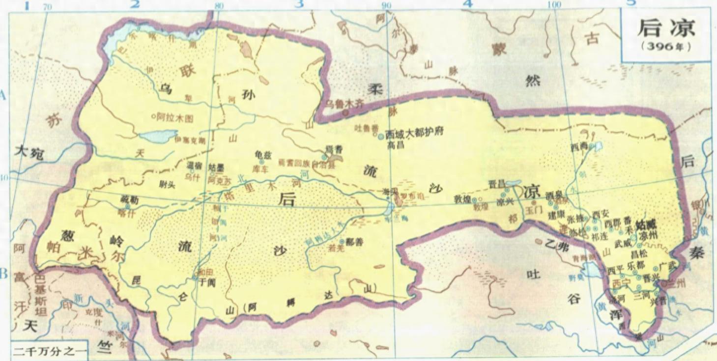 他弟弟秃发利鹿孤继位,改称河西王,三年后又死了。另一个弟弟秃发傉檀(365-415)于402年继位,改元弘昌,自称凉王。这个政权,历史上称为南凉,但立国的时间,还是从秃发乌孤397年在廉川割据算起。当秃发乌孤在后凉南部称雄时,后凉西北部也开始起了变化。