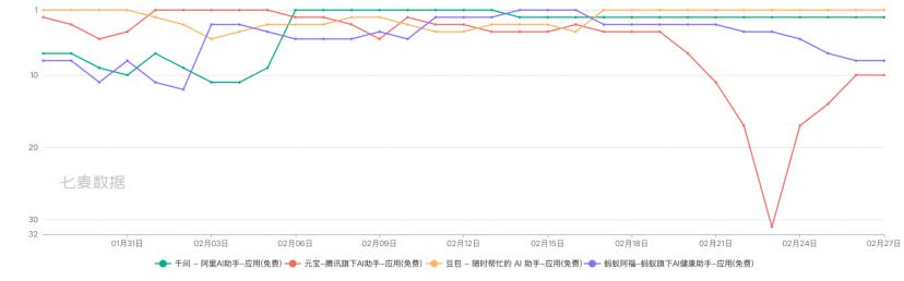 ● 春节期间主流AI应用的AppStore免费榜排名。图源:七麦数据