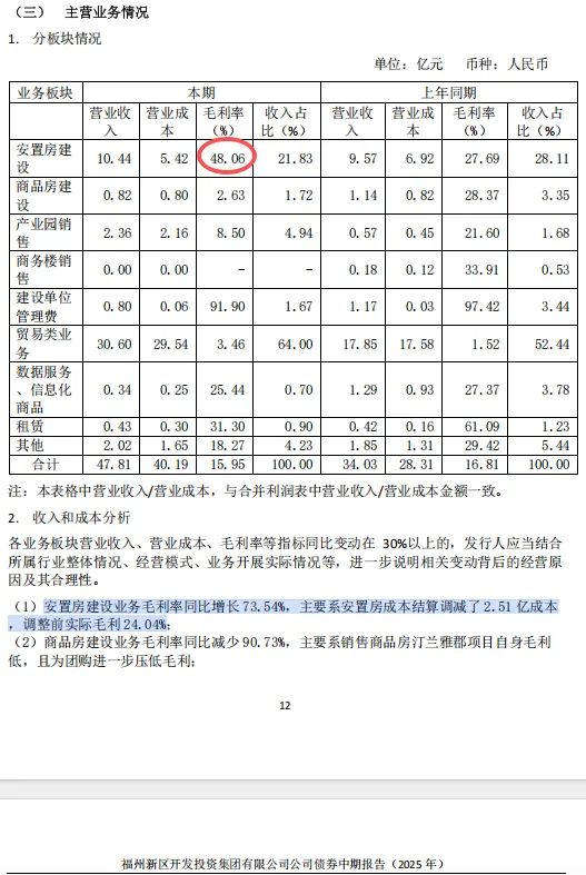 2025年上半年度给出的解释是:安置房建设业务毛利率同比增长73.54%,主要系安置房成本结算调减了2.51亿成本,调整前实际毛利24.04%。