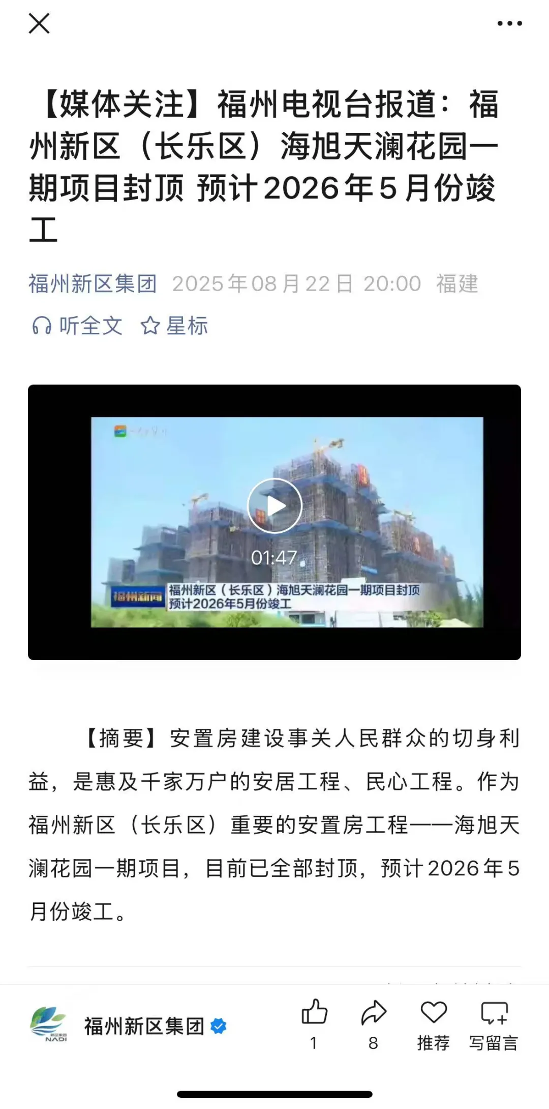 福州新区集团官号2025年8月曾转发了福州电视台对于福州新区安置房工程的报道,开篇即强调“安置房建设事关人民群众的切身利益,是惠及千家万户的安居工程、民心工程”。