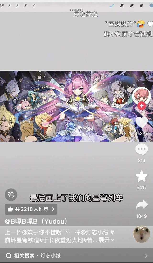 可能企划原本是想着一人画一个角色,或者一小块碎片,结果到了第3棒,这位老师不仅为所有角色铺好固有色,还额外添加了星穹列车作为背景,一下将成图进度条拉了一半。