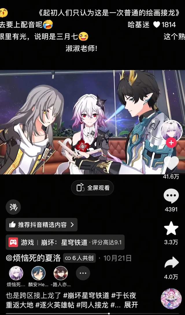 最终结果,就是《崩铁》的同人盛宴,真的在抖音持续了一个月。网友看到后面,已经不知道接力棒传到谁手里,自己看的又是第几棒作品了。大量制作精良的二创接龙内容,和短视频平台的传播特点相当契合,以至于许多网友直接将其视作追更,每天都在期待接下来会看到什么。