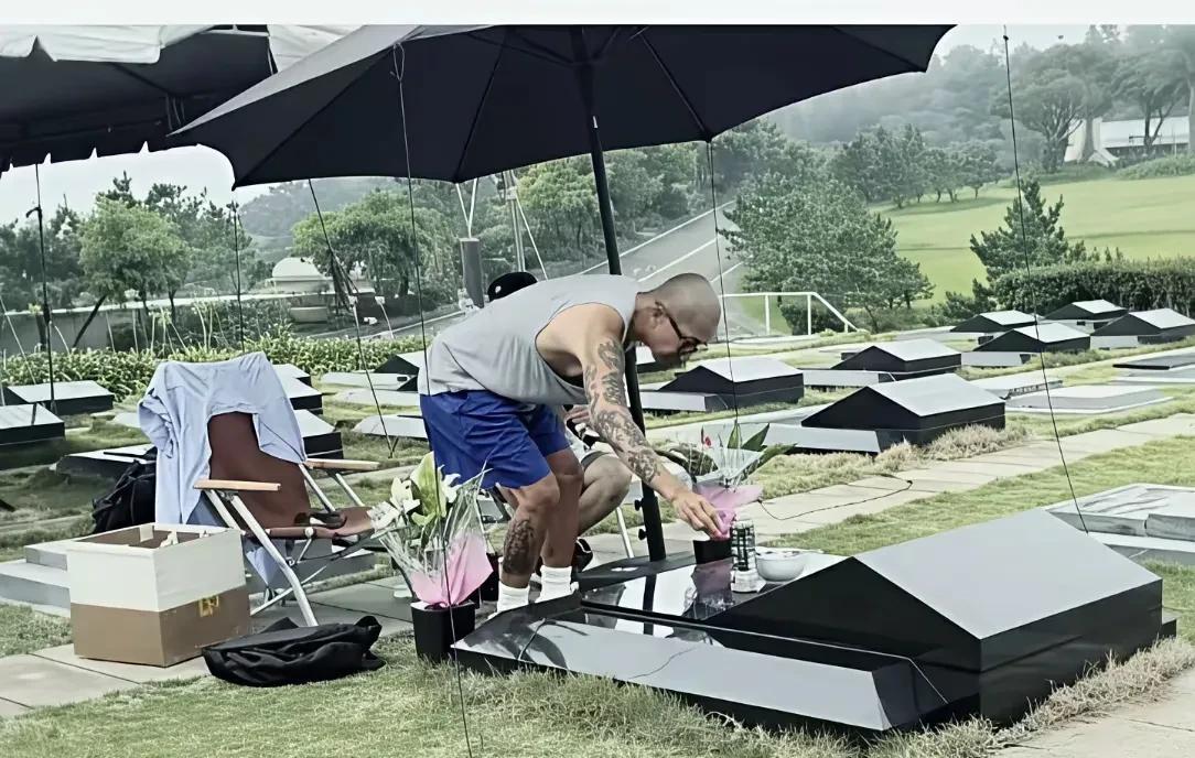 具俊烨他呀,天天去守墓, 阳伞、墨镜、休闲凳。 他打开电脑刷电影, 走时还要亲墓