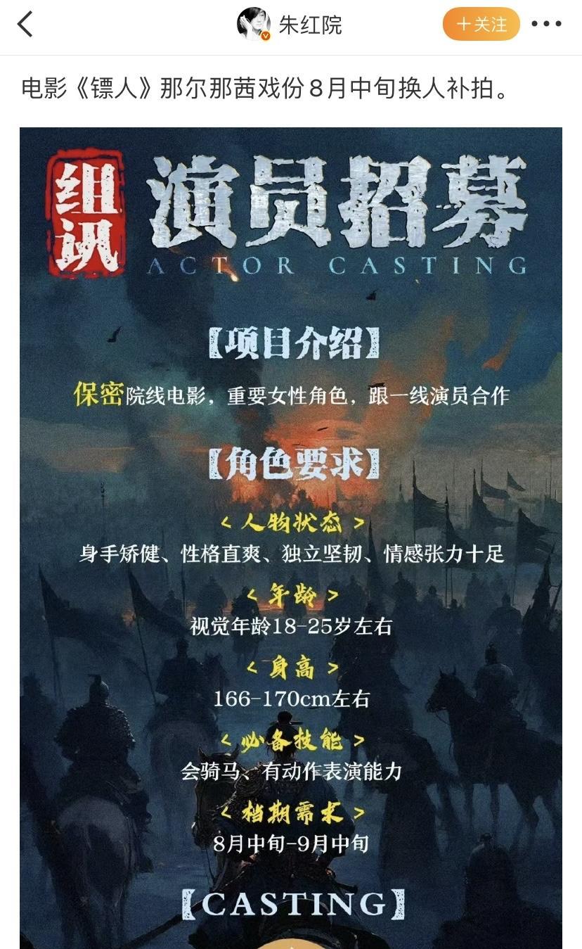 那尔那茜被《镖人》换掉了?疑似《镖人》剧组在找演员补拍那尔那茜的戏份,8月中旬补