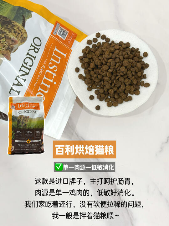 这款烘焙猫粮是进口牌子,主打呵护肠胃,肉源是单一鸡肉的,低敏好消化。我们家吃着还行,没有软便拉稀的问题,我一般是拌着猫粮喂~
